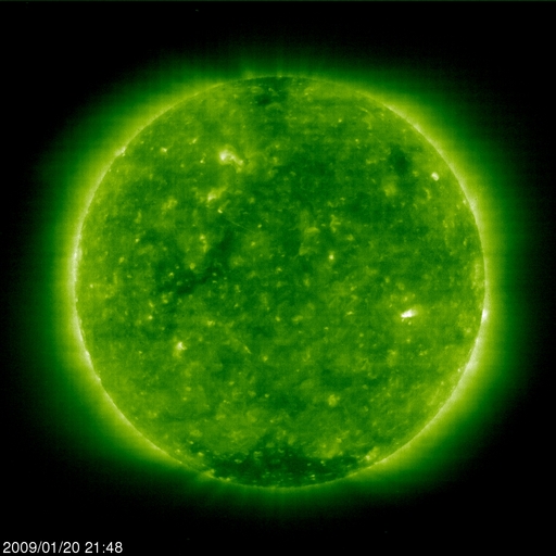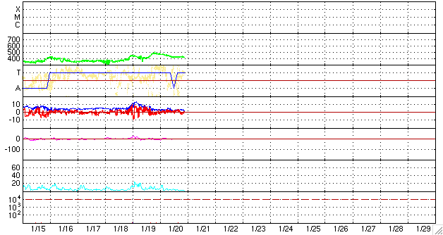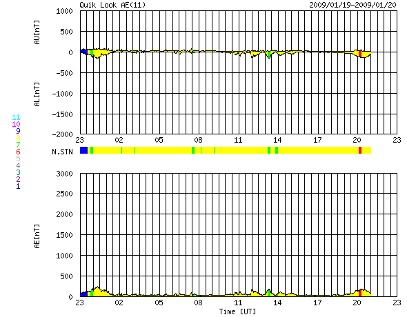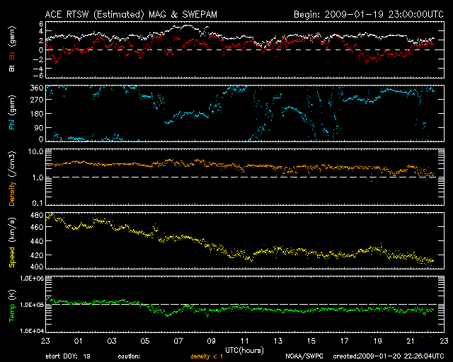 2009/ 1/21 07:24 更新 太陽風の速度は通常レベルに下がり、穏やかな状態です。太陽は無黒点にもどっています。 担当 篠原 昨日のニュースの後、太陽風の速度は次第に下がり、 20日20時(世界時20日11時)には、420km/秒と普通の速度レベルになりました。 磁場強度も3nTに弱まったままで、太陽風は穏やかです。 27日周期の図を見て下さい。 速度の高まりは、前周期とほとんど同じタイミングに見られたのですが、 山の高さはすっかり低くなっていて、 もはや高速風領域とは呼べない様な規模になっています。 このところ、太陽風速度の変化にめりはりがなくなり、 全体的に平坦になっている印象を感じているのですが、 その傾向がもう一段進んだように思います。 27日周期の図の前周期を見ると、12月31日に次の高速風が始まっています。 いまや、太陽風唯一の高速風領域と言ってもよさそうですが、 この高速風の回帰は、1月27日頃になりそうです。 SOHO EIT195の東側(左側)には、発生源のコロナホールが淡く見えています。 次に、こちらの高速風がどうなっているか、注目されます。 磁気圏活動はかなり静穏です。 AE指数にはほとんど変化が見られません。 放射線帯高エネルギー電子も、低いレベルのままです。 太陽は、1011黒点群が見えなくなり、無黒点となりました。 STEREO衛星でも、明るい領域は見えず、またしばらく無黒点が続きそうです。 SOHO EIT195による、太陽コロナの様子。21日7時(世界時20日22時)。 (c) SOHO (ESA & NASA) ![]() SOHOによる太陽の可視光写真。太陽は無黒点になりました。21日0時半(世界時20日15時半) (c) SOHO (ESA & NASA) ![]() ACEが観測した太陽風の磁場(1番上の枠、白線は全体の強度、赤線は南北成分) および、太陽風の密度(3番目の橙線)、速度(4番目の黄線) (c) NOAA/SWPC ![]() リアルタイムAE指数 下段のAEグラフの値が高くなると、オーロラ活動が活発化しています。 (c) 京都大学, NICT ![]() シベリアで観測された3日間の磁場データ 右側の3分の1が、昨日のデータになります。グラフが上がったり下がったりすると、オーロラ活動が活発化しています。 (c) NICT ![]() 27日の太陽周期に合わせたデータプロット 太陽が同じ面を地球に向けていた27日前の変化から、今後を予想することができます。 (c) NICT