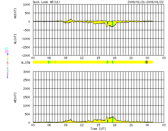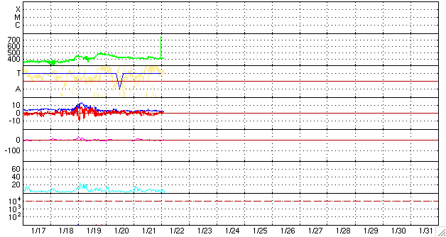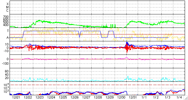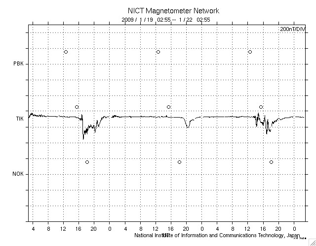 ACEが観測した太陽風の磁場(1番上の枠、白線は全体の強度、赤線は南北成分) および、太陽風の密度(3番目の橙線)、速度(4番目の黄線) (c) NOAA/SWPC ![]() リアルタイムAE指数 下段のAEグラフの値が高くなると、オーロラ活動が活発化しています。 (c) 京都大学, NICT ![]() シベリアで観測された3日間の磁場データ 右側の3分の1が、昨日のデータになります。グラフが上がったり下がったりすると、オーロラ活動が活発化しています。 (c) NICT ![]() 27日の太陽周期に合わせたデータプロット 太陽が同じ面を地球に向けていた27日前の変化から、今後を予想することができます。 (c) NICT