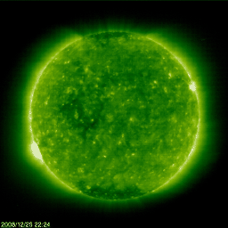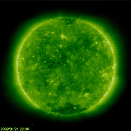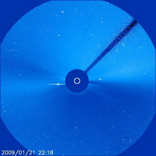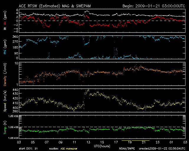 2009/ 1/22 11:56 更新 400km/秒台前半の穏やかな太陽風が続いています。磁気圏も概ね静穏です。 担当 篠原 SOHO衛星のLASCO C3カメラの視野を、木星がゆっくりと通過しています。 1週間前に視野の左端に入って、そろそろ太陽に重なろうとしているところです。 木星はこれから、もう10日ほどかけて、画面の右側へ通り過ぎて行きます。 太陽風は穏やかな状態が続いています。 速度は400km/秒から430km/秒の間をゆっくりと変化しています。 平均的な速度レベルです。 磁場強度は、3nTから2nTへ弱まっています。 磁気圏も概ね静穏ですが、 太陽風の磁場が-2nTほど南向きになっていたため、 AE指数で300nTの小規模活動が観測されています。 引き続き、穏やかな太陽風が続きそうです。 27日周期の図によると、次の高速風は1月27日頃になりそうです。 SOHO EIT195で、現在(左)と前周期(右)のコロナホールを比較してみましょう。 右の写真(27日前)の方が、コロナホールはやや見やすいようです。 太陽の中心付近から東(左)にかけて、淡い影が見えています。 このかたまりが、コロナホールです。 一方、現在の写真(左)では、コロナホールはやや分かりにくくなっています。 右と比べると、大きさが少し小さくなり、場所も右上へずれているように見えます。 回帰して来る高速風にも違いが現れるでしょうか。 今周期、19日からやって来ると思われた高速風は、姿を消してしまいました。 次の高速風も規模が弱まる様だと、太陽風の速度は、ますます平坦化してしまいます。 太陽は無黒点で、非常に静穏です。 SOHO LASCO C3の視野を、木星が通過中です。ゆっくりと西側に移動しています。 (c) SOHO (ESA & NASA) ![]() SOHOによる太陽の可視光写真。太陽は無黒点です。22日5時半(世界時21日20時半) (c) SOHO (ESA & NASA) ![]() SOHO衛星のEIT195カメラの映像 (c) SOHO (ESA & NASA)