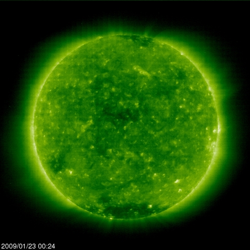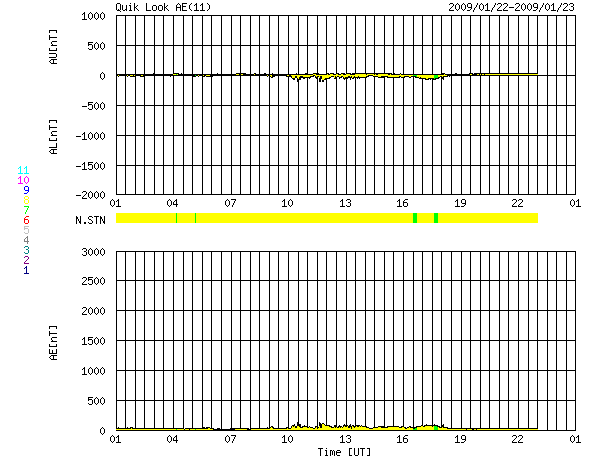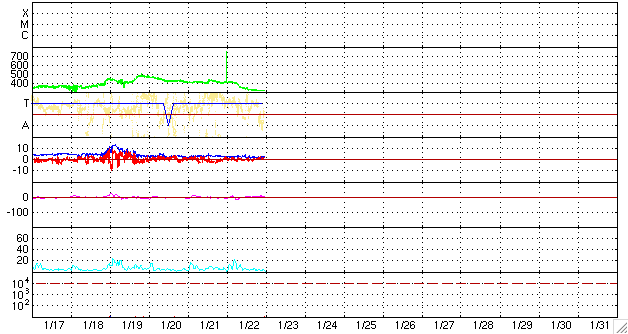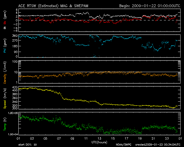 2009/ 1/23 09:34 更新 太陽風速度は320km/秒に下がり、磁気圏もとても静穏です。 担当 篠原 昨日、22日16時(世界時22日7時)から、太陽風の速度は低下に向かい、 一気に320kkm/秒へ下がりました。 平均的な速度のレベルから、遅い太陽風に変わっています。 これから4日間ほどは、前周期も300km/秒台の低速風が続いていました。 今回も、穏やかな太陽風がしばらく続くと思われます。 磁気圏も非常に静穏です。 AE指数は、全く変化していません。 SOHO EIT195では、とても淡いコロナホールが、太陽の中心に見えています。 前周期からの予想では、27日から太陽風に変化が見られそうですが、 この写真の見え方だと、26日に少し早まるかもしれません。 太陽は無黒点で、静穏です。 SOHO EIT195には、明るい領域は見られません。 STEREO衛星で3日ほど先回りをしても、何も見られず、 無黒点も続きそうです。 SOHO EIT195による、太陽コロナの様子。23日9時(世界時23日0時)。 (c) SOHO (ESA & NASA) ![]() SOHOによる太陽の可視光写真。太陽は無黒点です。23日4時(世界時22日19時) (c) SOHO (ESA & NASA) ![]() ACEが観測した太陽風の磁場(1番上の枠、白線は全体の強度、赤線は南北成分) および、太陽風の密度(3番目の橙線)、速度(4番目の黄線) (c) NOAA/SWPC ![]() リアルタイムAE指数 下段のAEグラフの値が高くなると、オーロラ活動が活発化しています。 (c) 京都大学, NICT ![]() シベリアで観測された3日間の磁場データ 右側の3分の1が、昨日のデータになります。グラフが上がったり下がったりすると、オーロラ活動が活発化しています。 (c) NICT ![]() 27日の太陽周期に合わせたデータプロット 太陽が同じ面を地球に向けていた27日前の変化から、今後を予想することができます。 (c) NICT