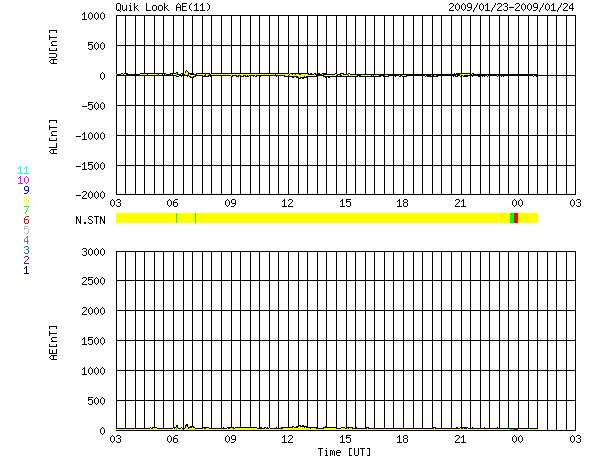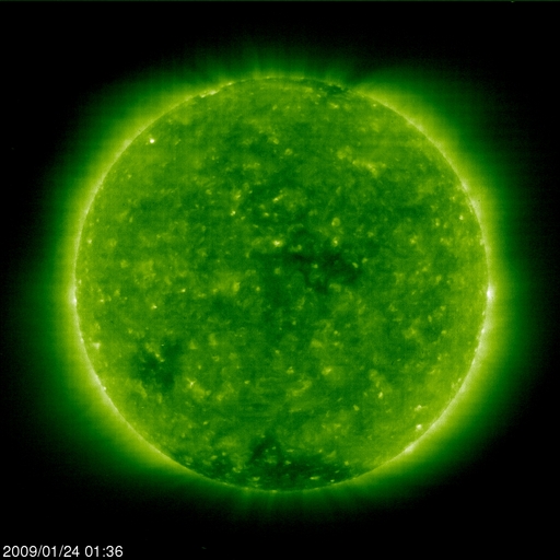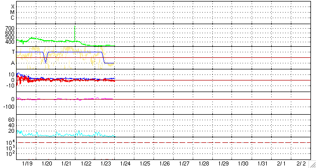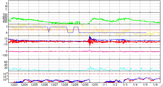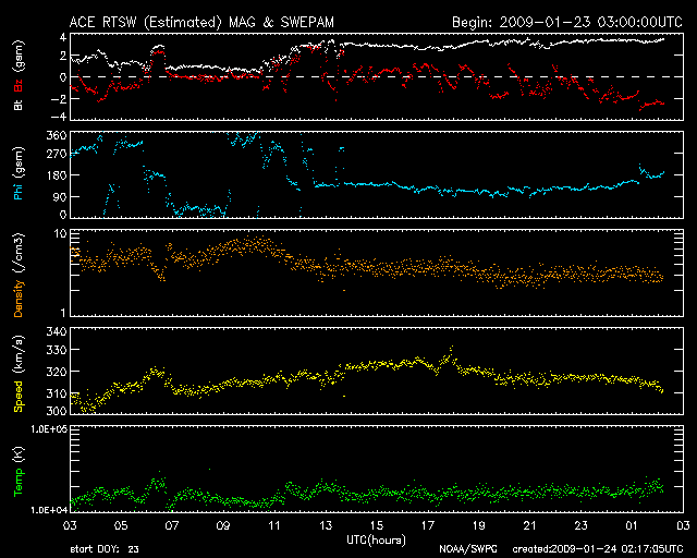 2009/ 1/24 11:17 更新 太陽風は320km/秒と遅く、磁気圏も非常に静穏です。太陽は無黒点が続いています。 担当 篠原 低速の太陽風が続いています。 太陽風の速度は、昨日から、310〜320km/秒と低い速度で安定しています。 磁場強度も、3nT前後と弱めです。 磁気圏への影響もたいへん小さく、 AE指数は全く平坦になっています。 この状態は、もう2〜3日続きます。 次の太陽風の乱れは、27日、もしくは26日に始まると予想されます。 といっても、前周期の高速風は、最高速度は550km/秒にとどまり、 1日半ほどの速度の高まりが、2回に分かれてやって来る程度と、 規模の小さな高速風でした。 今回も、同じくらいの高速風領域だろうと思われます。 SOHO EIT195には、コロナホールがとても淡く見えています。 太陽の中心から、西半球側へゆっくりと移動しています。 太陽は無黒点で、非常に静穏です。 SOHO EIT195による、太陽コロナの様子。24日10時半(世界時24日1時半)。 (c) SOHO (ESA & NASA) ![]() SOHOによる太陽の可視光写真。太陽は無黒点です。24日6時半(世界時23日21時半) (c) SOHO (ESA & NASA) ![]() ACEが観測した太陽風の磁場(1番上の枠、白線は全体の強度、赤線は南北成分) および、太陽風の密度(3番目の橙線)、速度(4番目の黄線) (c) NOAA/SWPC ![]() リアルタイムAE指数 下段のAEグラフの値が高くなると、オーロラ活動が活発化しています。 (c) 京都大学, NICT ![]() シベリアで観測された3日間の磁場データ 右側の3分の1が、昨日のデータになります。グラフが上がったり下がったりすると、オーロラ活動が活発化しています。 (c) NICT ![]() 27日の太陽周期に合わせたデータプロット 太陽が同じ面を地球に向けていた27日前の変化から、今後を予想することができます。 (c) NICT