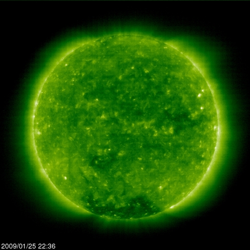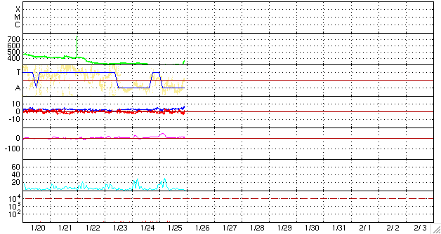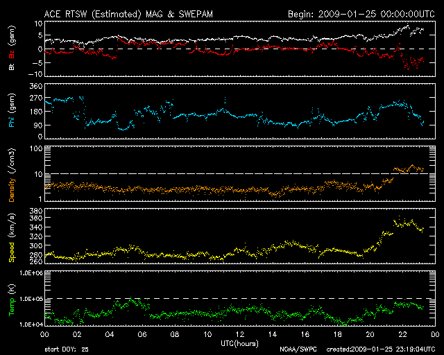 2009/ 1/26 08:19 更新 280km/秒の遅い太陽風から、340km/秒へやや上昇しています。高速風の始まりが近づいているかもしれません。 担当 篠原 昨日より、280km/秒とかなり速度の遅い、穏やかな太陽風が続いていました。 しかし、今朝、26日5時(世界時25日20時)頃から太陽風に変化が始まっています。 磁場強度が、5nTを越えて8nT前後になり、 プラズマ密度は、10〜20個/cm^3に増えています。 そして、速度は、小幅ですが340km/秒へ上昇しています。 これらの変化より、高速太陽風の到来が近づいている可能性があります。 まだ、変化としては小さいので、引き続き注目して下さい。 前周期のタイミングと比べると、1日近く早まっています。 磁気圏はまだ静穏です。 磁場強度が強まりつつありますので、 南向きが強まって、オーロラ活動を活発にする可能性があります。 現在のACEのデータも、-5nTほどの南向きの傾向に変わっています。 これから始まるのか、もうしばらく経ってからになるのかは分かりませんが、 しばらく、速度の高い太陽風が続くと予想されます。 SOHO EIT195の太陽写真を見ると、 中心から南東(左下)にかけて、コロナホールが淡く伸びています。 この領域は前周期にもあり、太陽風速度に2つ目の山を作りました(1月3日頃)。 今周期も、1月30日にかけて、速度の高まりが続きそうです。 放射線帯高エネルギー電子は、現在はたいへん低いレベルです。 高速風到来後、増加に向かう可能性があります。 ただ、前周期は目立った増加には繋がりませんでした。 太陽は無黒点で、静穏です。 SOHO EIT195による、太陽コロナの様子。26日7時半(世界時25日22時半)。 (c) SOHO (ESA & NASA) ![]() SOHOによる太陽の可視光写真。太陽は無黒点です。26日1時(世界時25日16時) (c) SOHO (ESA & NASA) ![]() ACEが観測した太陽風の磁場(1番上の枠、白線は全体の強度、赤線は南北成分) および、太陽風の密度(3番目の橙線)、速度(4番目の黄線) (c) NOAA/SWPC ![]() リアルタイムAE指数 下段のAEグラフの値が高くなると、オーロラ活動が活発化しています。 (c) 京都大学, NICT ![]() シベリアで観測された3日間の磁場データ 右側の3分の1が、昨日のデータになります。グラフが上がったり下がったりすると、オーロラ活動が活発化しています。 (c) NICT ![]() 27日の太陽周期に合わせたデータプロット 太陽が同じ面を地球に向けていた27日前の変化から、今後を予想することができます。 (c) NICT