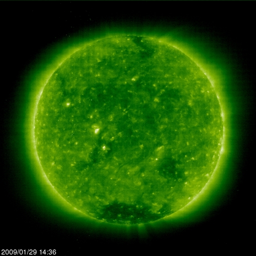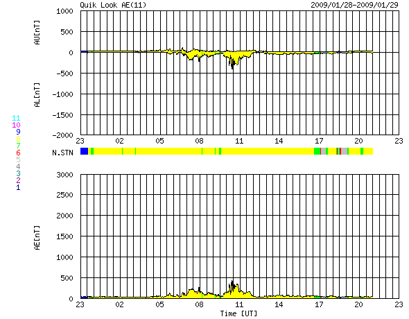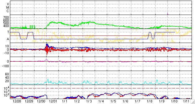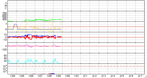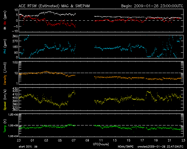 2009/ 1/30 07:47 更新 太陽風の速度は400km/秒を保ち、速度の上昇は発生していません。 担当 篠原 太陽風の速度は、400km/秒でほぼ安定しています。 磁場強度も、5nTから3nTに弱まってしまい、速度上昇の気配は見られません。 前周期の12月31日〜1月3日に見られた速度の盛り上がりは、 後半側も消えてしまったのかもしれません。 念のため、今日いっぱいは様子を見る必要があるでしょう。 磁気圏活動も概ね静穏です。 太陽風磁場南向きの影響で、200〜300nTの小規模変動がAE指数で一時的に発生した程度です。 現在は、太陽風磁場が弱まってしまったので、 今後も小規模の乱れが起こる程度でしょう。 太陽風は、まるまる1周期分高速風が消えてしまった様です。 今後、消えた高速風領域が回復するのか、 新しいコロナホールが生まれ、高速風領域が作られるのか、 SOHOの太陽写真やACEのデータに注目しましょう。 太陽は、無黒点で静穏です。 SOHO EIT195による、太陽コロナの様子。29日23時半(世界時29日14時半)。 (c) SOHO (ESA & NASA) ![]() SOHOによる太陽の可視光写真。黒点はありまえせん。29日23時半(世界時29日14時半)。 (c) SOHO (ESA & NASA) ![]() ACEが観測した太陽風の磁場(1番上の枠、白線は全体の強度、赤線は南北成分) および、太陽風の密度(3番目の橙線)、速度(4番目の黄線) (c) NOAA/SWPC ![]() リアルタイムAE指数 下段のAEグラフの値が高くなると、オーロラ活動が活発化しています。 (c) 京都大学, NICT ![]() シベリアで観測された3日間の磁場データ 右側の3分の1が、昨日のデータになります。グラフが上がったり下がったりすると、オーロラ活動が活発化しています。 (c) NICT ![]() 27日の太陽周期に合わせたデータプロット 太陽が同じ面を地球に向けていた27日前の変化から、今後を予想することができます。 (c) NICT
