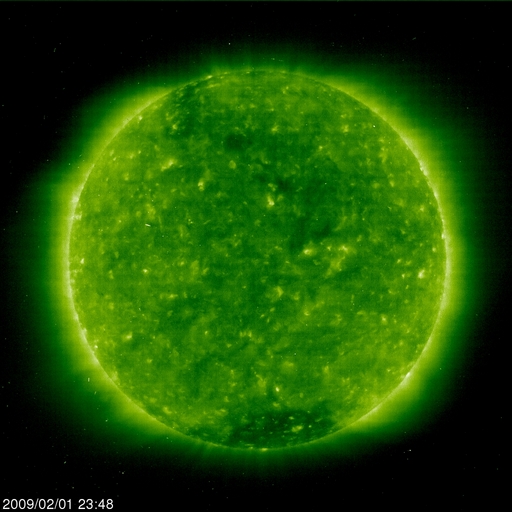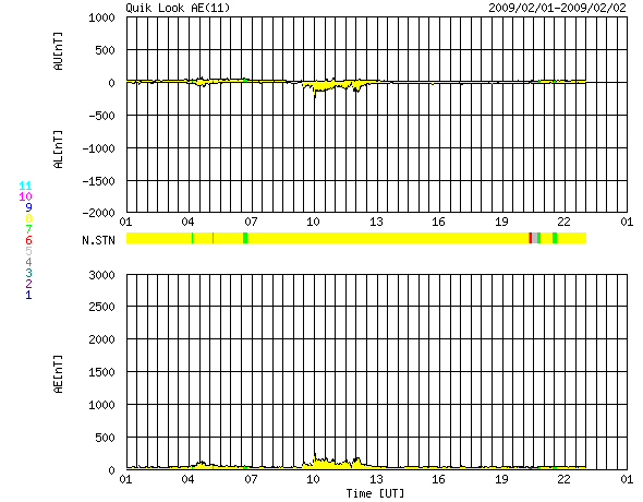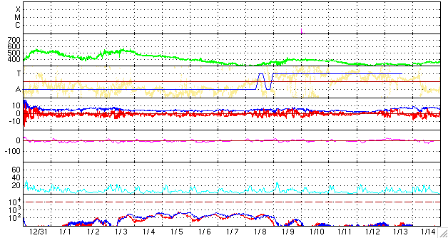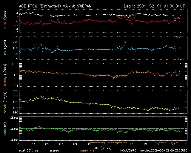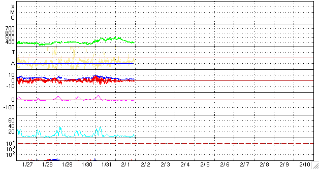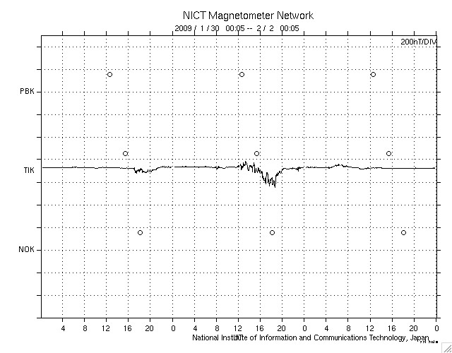 2009/ 2/ 2 09:04 更新 太陽風の速度は400km/秒に下がりました。磁気圏も穏やかです。 担当 篠原 太陽風の速度はゆっくりと下がり、 日本時間で2日に入った頃から、400kmと通常の速度に戻っています。 27日周期の図で見ると、速度の盛り上がりは1日半ほどでした。 ただし、速度としては、500km/秒に届くか届かないかという程度の高まりです。 磁気圏でも、ほとんど活動は起きていません。 AE指数は小さな値に留まっています。 今後は、基本的には速度の低い穏やかな太陽風が続くと思われます。 SOHO EIT195を見ると、太陽の北半球側に淡いコロナホールが斜めに走っています。 前周期の1月9-11日に、 これに対応すると思われる速度の小さな山(400km/秒程度)があります。 今周期も、このくらいのタイミングで、 太陽風に小さな変化がやって来るかもしれません。 SOHO EIT195で見える太陽コロナは、全体的にぼんやりとしており、 目立った太陽風の変化は、しばらく発生しないでしょう。 太陽の可視光写真は昨日の朝のものですが、 磁場、コロナの様子から無黒点が続いていると思われます。 SOHO EIT195による、太陽コロナの様子。2日8時半(世界時1日23時半)。 (c) SOHO (ESA & NASA) ![]() SOHOによる太陽の可視光写真。黒点はありません。1日9時半(世界時1日0時半) (c) SOHO (ESA & NASA) ![]() ACEが観測した太陽風の磁場(1番上の枠、白線は全体の強度、赤線は南北成分) および、太陽風の密度(3番目の橙線)、速度(4番目の黄線) (c) NOAA/SWPC ![]() リアルタイムAE指数 下段のAEグラフの値が高くなると、オーロラ活動が活発化しています。 (c) 京都大学, NICT ![]() シベリアで観測された3日間の磁場データ 右側の3分の1が、昨日のデータになります。グラフが上がったり下がったりすると、オーロラ活動が活発化しています。 (c) NICT ![]() 27日の太陽周期に合わせたデータプロット 太陽が同じ面を地球に向けていた27日前の変化から、今後を予想することができます。 (c) NICT