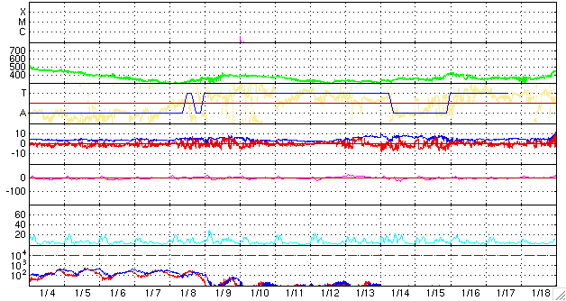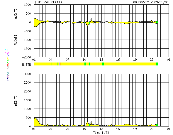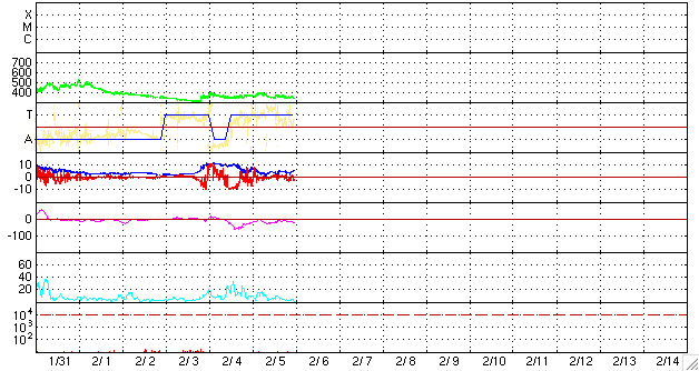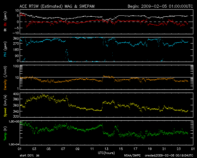 2009/ 2/ 6 09:20 更新 太陽風は低速で、穏やかです。磁気圏もすっかり静かになりました。 担当 篠原 太陽風磁場の大きな乱れは完全に終わり、 磁場強度は5nTでほぼ安定しています。 速度も350km/秒前後と低速で、穏やかな太陽風になっています。 磁気圏活動も落ち着いています。 AE指数の変化はなくなりました。 シベリア磁場データを見ると、図の中央部、2日前は活発に変化していますが、 右側の昨日のデータは、すっかり静かになっています。 穏やかな太陽風は、しばらく続きそうです。 SOHO EIT195を見ると、北極と南極にコロナホールが広がっていますが、 中低緯度域は、ぼんやりと光っているだけで、 目立ったコロナホールの影は見られません。 細かく見ると、太陽の北東部(左上)から中心部にかけて、 やや薄暗くなっていますが、この程度ではほとんど影響ないでしょう。 太陽も無黒点が続いています。 SOHO EIT195による、太陽コロナの様子。6日9時(世界時6日0時)。 (c) SOHO (ESA & NASA) ![]() SOHOによる太陽の可視光写真。黒点はありません。6日7時半(世界時5日22時半) (c) SOHO (ESA & NASA) ![]() ACEが観測した太陽風の磁場(1番上の枠、白線は全体の強度、赤線は南北成分) および、太陽風の密度(3番目の橙線)、速度(4番目の黄線) (c) NOAA/SWPC ![]() リアルタイムAE指数 下段のAEグラフの値が高くなると、オーロラ活動が活発化しています。 (c) 京都大学, NICT ![]() シベリアで観測された3日間の磁場データ 右側の3分の1が、昨日のデータになります。グラフが上がったり下がったりすると、オーロラ活動が活発化しています。 (c) NICT ![]() 27日の太陽周期に合わせたデータプロット 太陽が同じ面を地球に向けていた27日前の変化から、今後を予想することができます。 (c) NICT