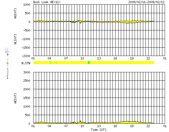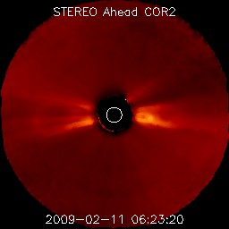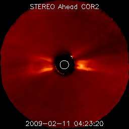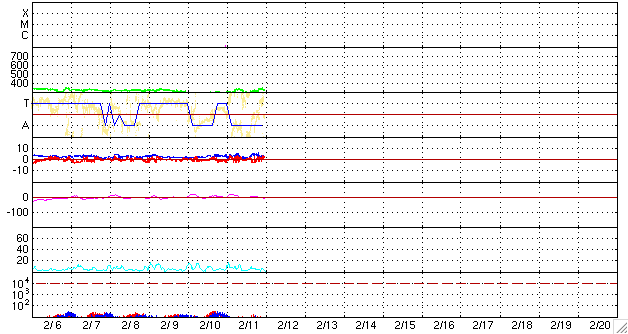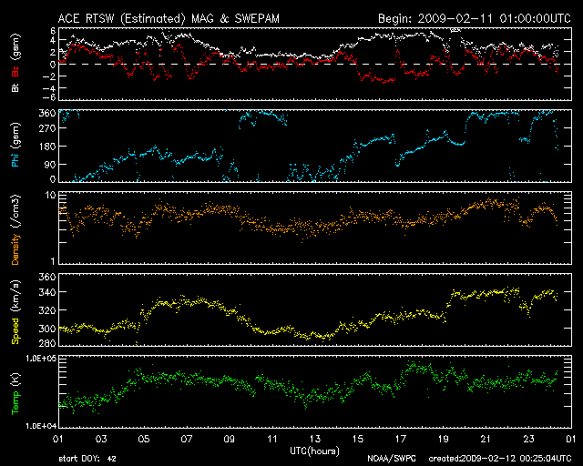 2009/ 2/12 09:22 更新 太陽風は300km/秒台前半と低速です。1012黒点群が出現したそうです。 担当 篠原 太陽風は、300km/秒から340km/秒と低速の状態が続いています。 磁場強度も、2〜5nTと弱めで、 穏やかな太陽風が続いています。 磁気圏も静穏で、AE指数はほとんど変化していません。 今日も、ひのでの太陽写真を掲載しています。 太陽の中心に、コロナホールの暗い領域が見えています。 1日ほど前に撮影された太陽写真なので、 現在は、もう少し西側(右側)へ進んでいます。 ここからの影響が、明日の午後か明後日くらいにやって来る可能性があります。 前周期は、このタイミングでは太陽風の乱れは全く起きなかったので、 27日周期の図からは、到来を予想することはできません。 大きな高速風にはならないと思いますが、 この1周期、太陽風には高速風領域が全く見られなくなっていたので、 どのような変化が見られるのか、注目して下さい。 太陽では、1012黒点群が出現したそうです。 ひのでの写真で、東側で明るく光っている部分ではないかと思います。 SOHOの可視光写真がないので、確認することができません。 昨日、ここでB1の小さなフレアが発生しました(昨日のニュース時に見えていた変化です)。 その後、STEREO Ahead衛星でCME(太陽ガスの放出現象)が観測されています。 太陽の左側へ向かって、白いガスが噴き出しています。 この、B1フレアに伴うものかもしれません。 ひのでによる太陽X線写真。11日3時(世界時10日18時)。 (c) 国立天文台/JAXA, SolarMonitor.org ![]() STEREO Ahead衛星のCOR2カメラで、CMEが観測されました。11日13時半(世界時11日4時半) (c) NASA ![]() STEREO Ahead衛星のCOR2カメラで、CMEが観測されました。11日15時半(世界時11日6時半) (c) NASA ![]() ACEが観測した太陽風の磁場(1番上の枠、白線は全体の強度、赤線は南北成分) および、太陽風の密度(3番目の橙線)、速度(4番目の黄線) (c) NOAA/SWPC ![]() リアルタイムAE指数 下段のAEグラフの値が高くなると、オーロラ活動が活発化しています。 (c) 京都大学, NICT ![]() シベリアで観測された3日間の磁場データ 右側の3分の1が、昨日のデータになります。グラフが上がったり下がったりすると、オーロラ活動が活発化しています。 (c) NICT ![]() 27日の太陽周期に合わせたデータプロット 太陽が同じ面を地球に向けていた27日前の変化から、今後を予想することができます。 (c) NICT