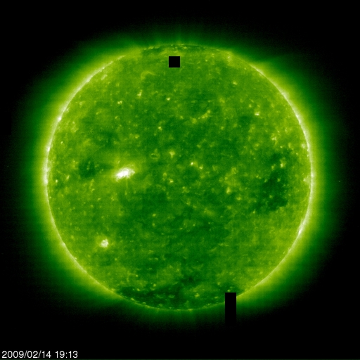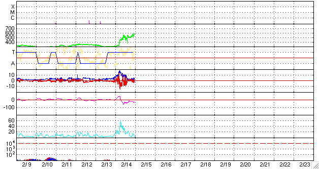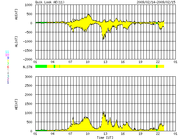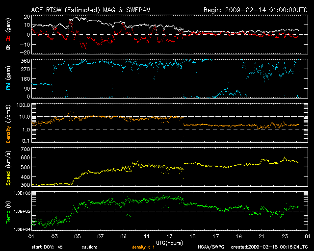 2009/ 2/15 09:16 更新 高速太陽風がやって来ました。速度は500km/秒台後半に上がっています。磁気圏活動も活発に発生しています。 担当 篠原 昨日のお昼、14日13時(世界時14日4時)頃から、 太陽風の速度が上昇を始め、久しぶりに高速太陽風がやって来ました。 夕方には、速度は500km/秒に達し、 今朝に入って、570km/秒ともう一段上がっています。 速度の上昇が始まる頃、太陽風の磁場強度は、最大で17nTまで強まりました。 磁場の南北成分も大きく変化し、-10nTを超える強い南向きも発生しています。 太陽風磁場南向きの傾向は、10時間ほど続き、 この間、比較的活発な磁気圏活動が発生しています。 AE指数では、500nTから1000nTにかけての中規模のオーロラ活動が、 半日に渡って観測されています。 高速風が久しぶりなのであたりまえですが、久しぶりに元気な変化を見た気がします。 シベリアの磁場データも、プラスにマイナスにと、大きく振れています。 頭の上で、活発な活動が発生していたのでしょう。 また、沖縄磁場データは-60nTほどの減少となっていて、 小規模の磁気嵐が発生しています。 現在、太陽風の速度は500km/秒台後半に上がっています。 一方、磁場強度は5nTを割るくらいへ弱まっています。 このため、高速風は既にピークを迎えていて、 この後は次第に低下に向かうだろうと思われます。 SOHO EIT195の観測が再開されました。 コロナホールは既に西の端に近づいています。 このことも、高速風は長く続かないだろうということを示しています。 放射線帯高エネルギー電子は、今のところ目立った変化をしていません。 明日にかけてどうなるか、様子を見て下さい。 太陽は無黒点です。 フレアは現れなくなって、静かになっています。 SOHO EIT195による、太陽コロナの様子。15日4時(世界時14日19時)。 (c) SOHO (ESA & NASA) ![]() SOHOによる太陽の可視光写真。黒点はありません。15日0時半(世界時14日15時半) (c) SOHO (ESA & NASA) ![]() ACEが観測した太陽風の磁場(1番上の枠、白線は全体の強度、赤線は南北成分) および、太陽風の密度(3番目の橙線)、速度(4番目の黄線) (c) NOAA/SWPC ![]() リアルタイムAE指数 下段のAEグラフの値が高くなると、オーロラ活動が活発化しています。 (c) 京都大学, NICT ![]() シベリアで観測された3日間の磁場データ 右側の3分の1が、昨日のデータになります。グラフが上がったり下がったりすると、オーロラ活動が活発化しています。 (c) NICT ![]() 沖縄の磁場擾乱 下へ下がるほど、擾乱が発達している事を意味します。 (c) NICT ![]() 27日の太陽周期に合わせたデータプロット 太陽が同じ面を地球に向けていた27日前の変化から、今後を予想することができます。 (c) NICT