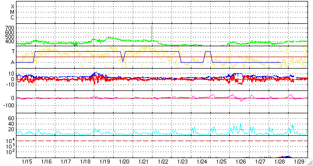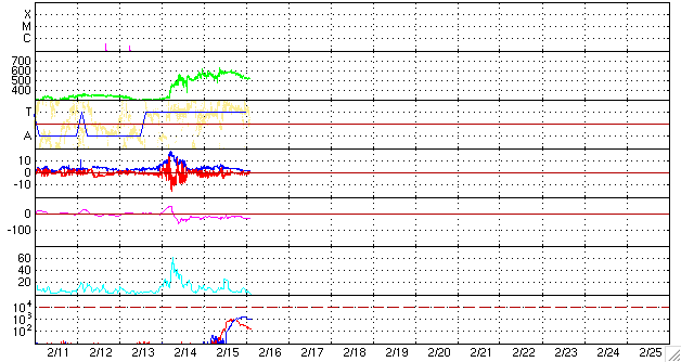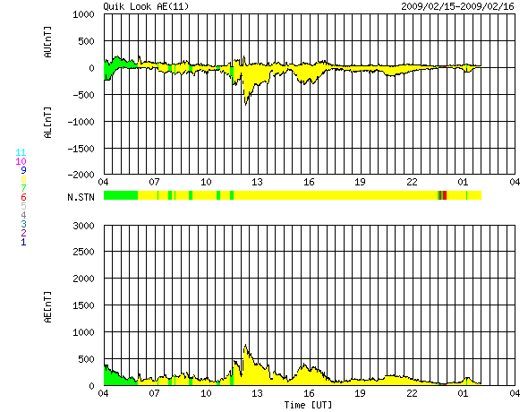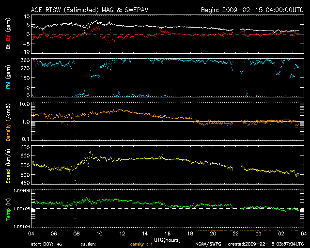2009/ 2/16 12:38 更新 500km/秒台の高速風が続いています。太陽風の速度は低下に向かっています。 担当 篠原 太陽風は、昨日いっぱいは580km/秒の高速状態を保ちました。 今日に入った頃から速度はゆっくりと低下し、 現在は、500km/秒まで下がっています。 太陽風の磁場強度も、昨日までは4nTほどを保っていましたが、 今日になって大きく下がり、2nTくらいに弱まっています。 このことから、高速太陽風の領域は終盤に入っていると思われます。 速度はやがて500km/秒を割り、 明日には、通常レベルの速度に下がるのではないでしょうか。 磁気圏では、AE指数で、700nTと300nTの中小規模活動がそれぞれ発生しています。 目立った変化はこのくらいで、後半は太陽風の速度も磁場も弱まって来たので、 磁気圏も落ち着くようになりました。 高速風は、もうしばらく残りそうですが、 磁気圏活動の方は、一足先に静かになりそうです。 今回、期間は短かったものの、600km/秒に迫る高速風が40日ぶりに帰って来ました。 左のリンクから、27日周期の全期間版を選んでみて下さい。 今後、どのような高速風パターンに落ち着くのか、 ゆっくりと監視を続けましょう。 この高速風が終わると、太陽風は一休みになりそうです。 高速風の影響で、放射線帯高エネルギー電子が一気に強まっています。 まだ、1000のレベルに達した程度ですが、引き続き変化に注意して下さい。 太陽は磁場の強まりはあるものの、無黒点だとのことです。 フレア活動は、静穏です。 SOHO EIT195による、太陽コロナの様子。16日9時(世界時16日0時)。 (c) SOHO (ESA & NASA) ![]() SOHOによる太陽の磁場写真。磁場の強まりが見えています。16日1時(世界時15日16時) (c) S ![]() ACEが観測した太陽風の磁場(1番上の枠、白線は全体の強度、赤線は南北成分) および、太陽風の密度(3番目の橙線)、速度(4番目の黄線) (c) NOAA/SWPC ![]() リアルタイムAE指数 下段のAEグラフの値が高くなると、オーロラ活動が活発化しています。 (c) 京都大学, NICT ![]() シベリアで観測された3日間の磁場データ 右側の3分の1が、昨日のデータになります。グラフが上がったり下がったりすると、オーロラ活動が活発化しています。 (c) NICT ![]() 27日の太陽周期に合わせたデータプロット 太陽が同じ面を地球に向けていた27日前の変化から、今後を予想することができます。 (c) NICT