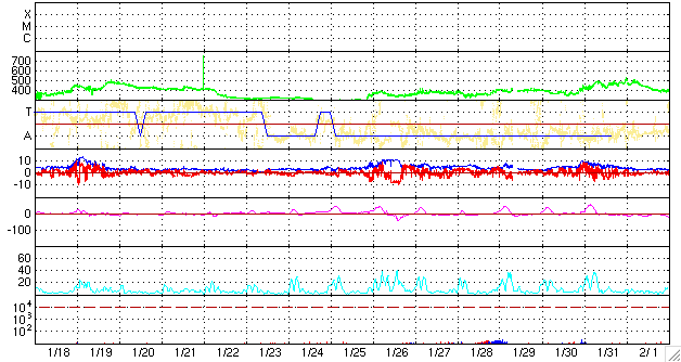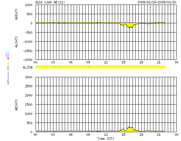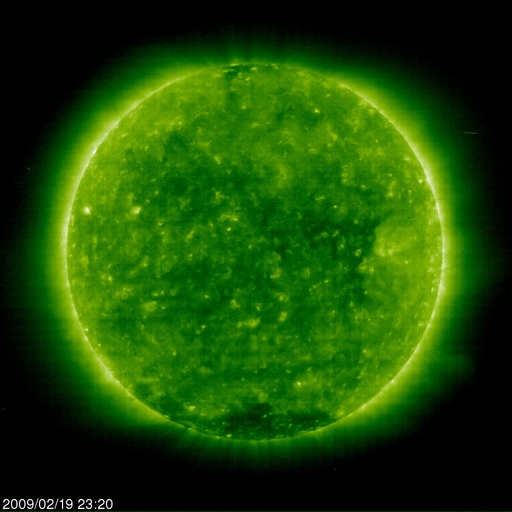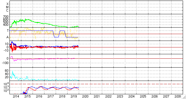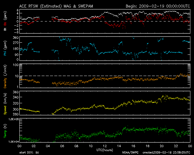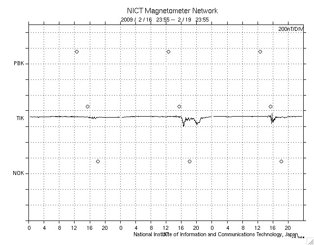 2009/ 2/20 08:58 更新 300km/秒台前半の遅い太陽風が続いています。穏やかな宇宙天気です。 担当 篠原 最近の太陽黒点についてまとめました。 立ち上がらない第24期 --2009年を迎えて-- 300km/秒台前半の低速の太陽風が続いています。 ACE衛星の観測によると、昨日300km/秒だった太陽風の速度は、 少し上がって、340km/秒になっています。 ACEの図では、立派な上昇にも見えますが、変化は小幅です。 27日周期の図も比べてみて下さい。 磁場強度は4nTと普通の強さに戻っています。 磁気圏のオーロラ活動も静かです。 太陽風磁場が南を向いた影響で、小さな変化がひとつ見えていますが、 その他は全く変化していません。 SOHO EIT195では、コロナホールが西半球側にだいぶ移動しています。 そろそろ地球への影響開始位置(みかけの位置です)に達します。 今日の後半か明日くらいに、太陽風に変化が始まるかもしれません。 この期間は、前周期は目立った変化はありませんでした。 コロナホールの規模を考えても、やって来る乱れは小規模だろうと思います。 太陽は無黒点で、静穏な状態が続いています。 SOHO EIT195を見ても、明るい領域は全くなく、太陽活動は本当に静かです。 SOHO EIT195による、太陽コロナの様子。20日8時(世界時19日23時)。 (c) SOHO (ESA & NASA) ![]() SOHOによる太陽の可視光写真。黒点はありません。19日23時(世界時19日14時) (c) SOHO (ESA & NASA) ![]() ACEが観測した太陽風の磁場(1番上の枠、白線は全体の強度、赤線は南北成分) および、太陽風の密度(3番目の橙線)、速度(4番目の黄線) (c) NOAA/SWPC ![]() リアルタイムAE指数 下段のAEグラフの値が高くなると、オーロラ活動が活発化しています。 (c) 京都大学, NICT ![]() シベリアで観測された3日間の磁場データ 右側の3分の1が、昨日のデータになります。グラフが上がったり下がったりすると、オーロラ活動が活発化しています。 (c) NICT ![]() 27日の太陽周期に合わせたデータプロット 太陽が同じ面を地球に向けていた27日前の変化から、今後を予想することができます。 (c) NICT