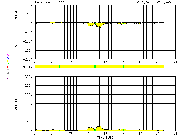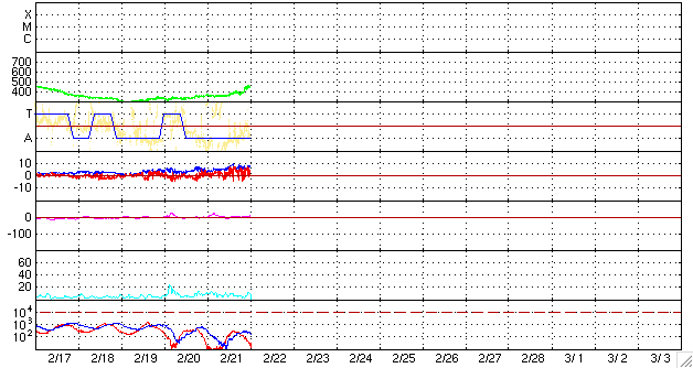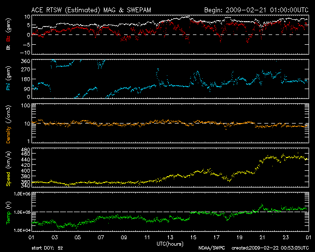2009/ 2/22 09:53 更新 太陽風の速度は、450km/秒に上がっています。磁気圏は概ね静穏です。 担当 篠原 太陽風に変化がやって来ました。 ACE衛星の観測によると、 昨夜、21日22時(世界時21日13時)頃から、太陽風の速度が上昇を始め、 半日ほどかけて、360km/秒から450km/秒へ上がっています。 今のところ変化は小幅で、現在の速度も、やや高めという程度です。 磁気圏活動は概ね静穏に推移しています。 太陽風の磁場強度は、8nTほどに強まっています。 まだ強まったままなので、この後、速度はもう一段上昇する可能性があります。 27日周期の図を見ると、変化が到来したタイミングは、 前周期の1月25-26日に始まった小さな変化と同じくらいでした。 SOHO EIT195の太陽コロナ写真を見ると、 コロナホールは既に太陽の西側へ移動し、 写真では、はっきり見つけることはできません。 現在の太陽風の変化も、たいした強まりにはならないでしょう。 太陽の東側(左側)にはコロナホールは見られず、 この後は、穏やかな太陽風がしばらく続きそうです。 太陽は無黒点です。 SOHO EIT195による、太陽コロナの様子。22日8時半(世界時21日23時半)。 (c) SOHO (ESA & NASA) ![]() SOHOによる太陽の可視光写真。太陽は無黒点です。21日22時(世界時21日13時) (c) SOHO (ESA & NASA) ![]() ACEが観測した太陽風の磁場(1番上の枠、白線は全体の強度、赤線は南北成分) および、太陽風の密度(3番目の橙線)、速度(4番目の黄線) (c) NOAA/SWPC ![]() リアルタイムAE指数 下段のAEグラフの値が高くなると、オーロラ活動が活発化しています。 (c) 京都大学, NICT ![]() シベリアで観測された3日間の磁場データ 右側の3分の1が、昨日のデータになります。グラフが上がったり下がったりすると、オーロラ活動が活発化しています。 (c) NICT ![]() 27日の太陽周期に合わせたデータプロット 太陽が同じ面を地球に向けていた27日前の変化から、今後を予想することができます。 (c) NICT