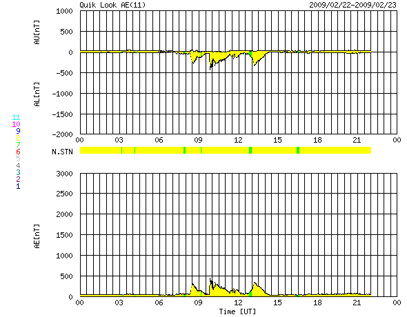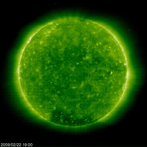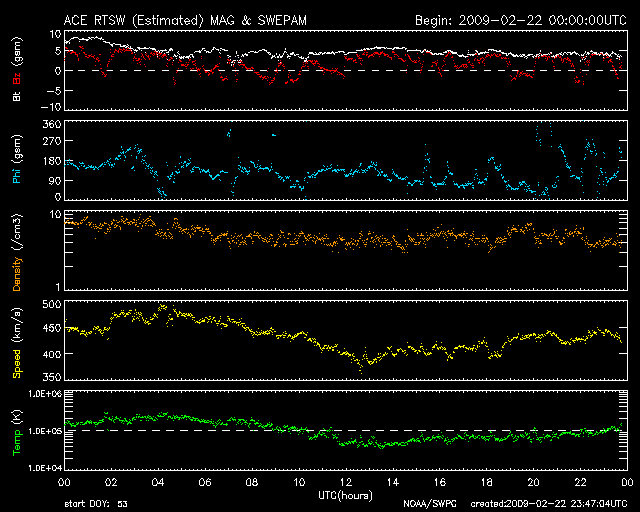 2009/ 2/23 08:47 更新 太陽風は、400km/秒台前半の比較的穏やかな状態です。太陽は無黒点が続いています。 担当 篠原 太陽風の速度は、昨日のお昼頃、 22日13時(世界時22日4時)に500km/秒近くまで上がりました。 この頃が最高速度だった様で、その後はやや下がって、 400〜450km/秒と平均的な速度レベルで安定しています。 磁場強度も、8nTから5nTへやや弱まりました。 コロナホールの影響は、なくなりつつあります。 AE指数は、図の中心付近で、300nTほどの小規模変動が3回ほど発生しています。 しかし、前後の時間帯は全く静穏です。 太陽風の乱れは小規模で終わりつつあり、 今後、太陽風、磁気圏は穏やかな状態が続くでしょう。 SOHO EIT195の太陽コロナは、全体的にのっぺりとしていて、 コロナホールも活動領域も見られません。 STEREO Behindで先回りしても、太陽は同じ様な状況で、 これから10日以上にわたって、穏やかな太陽風が続きそうです。 太陽は無黒点が続いています。 この様子だと、今月の無黒点日数もかなり高くなりそうです。 SOHO EIT195による、太陽コロナの様子。23日4時(世界時22日19時)。 (c) SOHO (ESA & NASA) ![]() SOHOによる太陽の可視光写真。太陽は無黒点です。22日2時半(世界時22日17時半) (c) SOHO (ESA & NASA) ![]() ACEが観測した太陽風の磁場(1番上の枠、白線は全体の強度、赤線は南北成分) および、太陽風の密度(3番目の橙線)、速度(4番目の黄線) (c) NOAA/SWPC ![]() リアルタイムAE指数 下段のAEグラフの値が高くなると、オーロラ活動が活発化しています。 (c) 京都大学, NICT ![]() シベリアで観測された3日間の磁場データ 右側の3分の1が、昨日のデータになります。グラフが上がったり下がったりすると、オーロラ活動が活発化しています。 (c) NICT ![]() 27日の太陽周期に合わせたデータプロット 太陽が同じ面を地球に向けていた27日前の変化から、今後を予想することができます。 (c) NICT