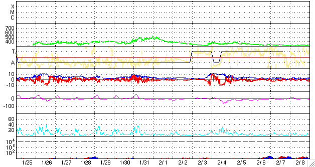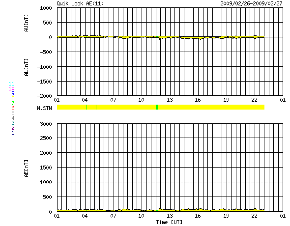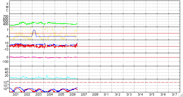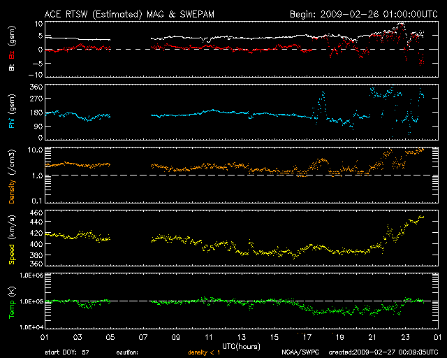 2009/ 2/27 09:10 更新 400km/秒台の太陽風が続いています。太陽は無黒点に戻りました。 担当 篠原 速度400km/秒台の太陽風が続いています。 昨夜、400km/秒をわずかに割りましたが、 今朝になって再び上昇し、現在は440km/秒となっています。 この速度上昇では、磁場強度や密度も変化していて、 もうしばらく速度上昇が続くかもしれません。 ただし、大きな乱れになることはないでしょう。 磁気圏活動は非常に静穏です。 AE指数には全く変化が見られません。 これは、太陽風磁場の南北成分が、 0nT付近に留まっていたことが効いているのでしょう。 SOHO EIT195を見ると、太陽の中心付近に淡いコロナホールがあるようです。 規模は小さいので、大きな影響はないと思いますが、 この領域の影響が及ぶ頃まで、400km/秒台の太陽風が続くかもしれません。 太陽では、1013黒点群が消え、無黒点に戻りました。 SOHO EIT195では、南半球側の東端から、 もうひとつの明るい領域が上がって来ています。 可視光写真、磁場写真ではまだ様子がよく分かりませんが、 黒点があるほどの規模ではなさそうです。 SOHO EIT195による、太陽コロナの様子。27日8時半(世界時26日23時半)。 (c) SOHO (ESA & NASA) ![]() SOHOによる太陽の可視光写真。黒点は見えなくなりました。27日7時半(世界時26日22時半)。 (c) SOHO (ESA & NASA) ![]() ACEが観測した太陽風の磁場(1番上の枠、白線は全体の強度、赤線は南北成分) および、太陽風の密度(3番目の橙線)、速度(4番目の黄線) (c) NOAA/SWPC ![]() リアルタイムAE指数 下段のAEグラフの値が高くなると、オーロラ活動が活発化しています。 (c) 京都大学, NICT ![]() シベリアで観測された3日間の磁場データ 右側の3分の1が、昨日のデータになります。グラフが上がったり下がったりすると、オーロラ活動が活発化しています。 (c) NICT ![]() 27日の太陽周期に合わせたデータプロット 太陽が同じ面を地球に向けていた27日前の変化から、今後を予想することができます。 (c) NICT