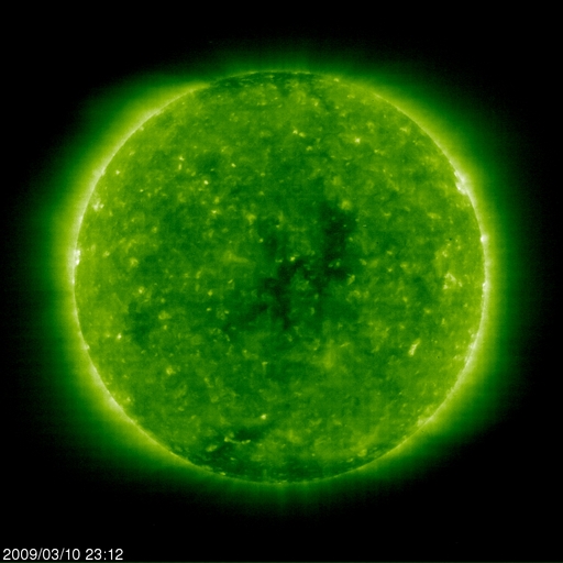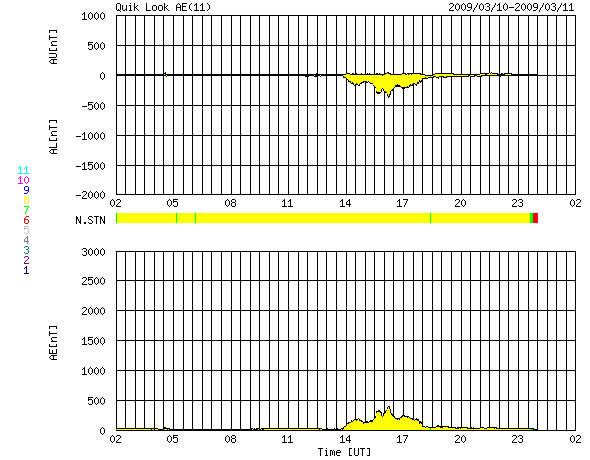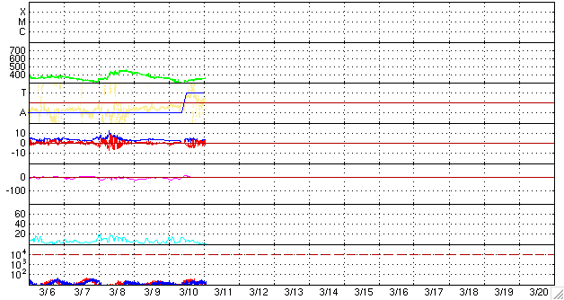 2009/ 3/11 10:42 更新 300km/秒台前半の穏やかな太陽風が続いています。明後日頃から高速風になるでしょう。 担当 篠原 300km/秒台前半の低速の太陽風が続いています。 磁場強度も、2〜5nTと比較的弱めの状態が続いています。 ただ、細かく見ると、 10日20時(世界時10日11時)頃から、太陽風磁場が細かく変動する様になっています。 速度も小幅ですが上昇の傾向を示していて、 太陽風の様子が変化した様です。 10日20時(世界時10日11時)から11日3時(10日18時)にかけては、 太陽風磁場の南北成分が-4nTほどの南寄りになりました。 その影響がAE指数の300nTの山となって見られています。 ここで、小規模のオーロラ活動が発生した様です。 太陽風は、もうしばらく静穏な状態が続きます。 SOHO EIT195を見ると、コロナホールが太陽の中心を通過中です。 今、地球に向かって、速度の高い太陽風が噴き出しているところです。 高速風の始まりは、明後日、13日になると思われます。 太陽は無黒点で、静穏です。 SOHO EIT195による、太陽コロナの様子。11日8時(世界時10日23時)。 (c) SOHO (ESA & NASA) ![]() SOHOによる太陽の可視光写真。黒点はありません。11日7時半(世界時10日22時半)。 (c) SOHO (ESA & NASA) ![]() ACEが観測した太陽風の磁場(1番上の枠、白線は全体の強度、赤線は南北成分) および、太陽風の密度(3番目の橙線)、速度(4番目の黄線) (c) NOAA/SWPC ![]() リアルタイムAE指数 下段のAEグラフの値が高くなると、オーロラ活動が活発化しています。 (c) 京都大学, NICT ![]() シベリアで観測された3日間の磁場データ 右側の3分の1が、昨日のデータになります。グラフが上がったり下がったりすると、オーロラ活動が活発化しています。 (c) NICT ![]() 27日の太陽周期に合わせたデータプロット 太陽が同じ面を地球に向けていた27日前の変化から、今後を予想することができます。 (c) NICT