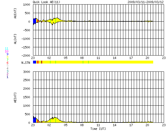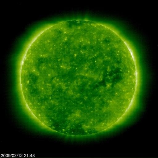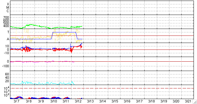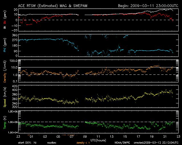 2009/ 3/13 07:06 更新 太陽風の磁場強度が20nTに強まっています。高速風の到来が近づいています。 担当 篠原 太陽風に変化が現れています。 高速太陽風の到来が近づいている様です。 変化は、磁場強度から始まっています。 実は、昨日のニュースの直後、磁場強度が急に10nTに強まっていました。 しかし、速度の変化などは特に発生せず、360km/秒の低速風が安定して続きました。 そして、日付が今日に変わった頃から、磁場強度が再び上昇を始めました。 現在、20nTにまで強まっています。 かなり強い状態です。 速度もゆっくりと、390km/秒に上がっています。 これから更に、本格的に上昇を始めると思われます。 27日周期の図を見て下さい。 若干早まっていますが、前周期と同じ様な展開になりそうです。 前周期は、高速風は600km/秒にまで上昇し、高速状態は2日半ほど続きました。 現在の磁気圏活動は、全く静穏です。 太陽風の磁場強度が大きく強まっていますが、南北成分が安定して北を向いているためです。 しかし、ACEの図の最新のところでは、南北成分の赤線がゆっくりと低下をしています。 この後、南側(マイナス側)に大きく反転する可能性があります。 その場合、磁気圏活動のスイッチが入り、オーロラ活動が強まるでしょう。 速度の上昇を伴うと、活動は、より大きなものとなります。 磁場強度が大きく強まっている間は、特に注意が必要です。 27日周期の図で、前周期の変化を見ると、磁場強度の強まりは半日程度続いてます。 今回も、今日いっぱいは注意が必要でしょう。 放射線帯高エネルギー電子は、現在は低いレベルで安定しています。 高速風の到来後、上昇する可能性がありますので、 明日以降注意が必要です。 太陽は無黒点です。 SOHO EIT195による、太陽コロナの様子。13日7時(世界時12日22時)。 (c) SOHO (ESA & NASA) ![]() SOHOによる太陽の可視光写真。黒点はありません。13日2時(世界時12日17時)。 (c) SOHO (ESA & NASA) ![]() ACEが観測した太陽風の磁場(1番上の枠、白線は全体の強度、赤線は南北成分) および、太陽風の密度(3番目の橙線)、速度(4番目の黄線) (c) NOAA/SWPC ![]() リアルタイムAE指数 下段のAEグラフの値が高くなると、オーロラ活動が活発化しています。 (c) 京都大学, NICT ![]() シベリアで観測された3日間の磁場データ 右側の3分の1が、昨日のデータになります。グラフが上がったり下がったりすると、オーロラ活動が活発化しています。 (c) NICT ![]() 27日の太陽周期に合わせたデータプロット 太陽が同じ面を地球に向けていた27日前の変化から、今後を予想することができます。 (c) NICT