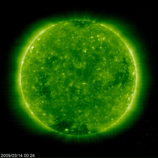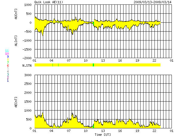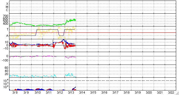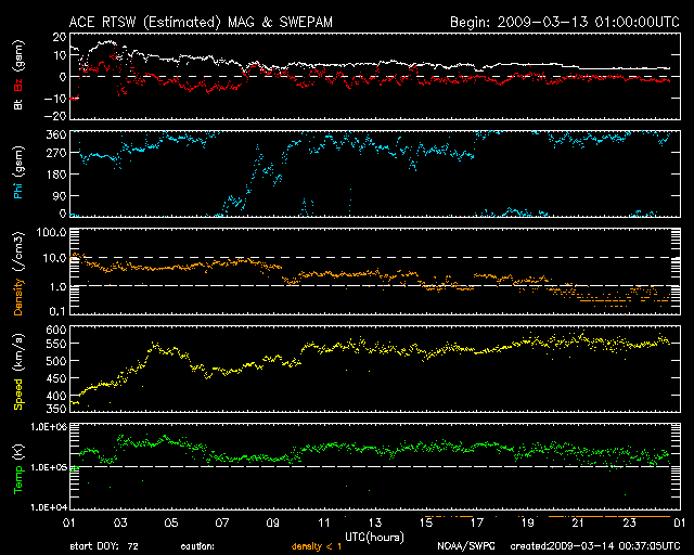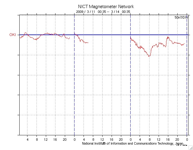 2009/ 3/14 09:38 更新 高速風が来ました。速度は550km/秒に上昇し、活発なオーロラ活動も続いています。 担当 篠原 コロナホールの影響による、高速風が来ています。 昨日の朝、13日10時(世界時13日1時)頃から、太陽風速度の上昇が始まりました。 お昼には500km/秒に達し、夜にかけて550km/秒まで上昇しています。 以降はこの速度で安定しています。 20nTに強まっていた磁場強度は、速度の上昇とともに弱まり、 昨夜のうちに5nTと、通常の強さ程度に落ちています。 昨日のニュースの直後から、磁場の南北成分が南寄りの傾向を取る様になり、 磁気圏活動に刺激を与えています。 AE指数を見ると、前半に800nTレベルの強い擾乱が発生し、 後半も500nTくらいの中規模活動が続いています。 シベリア磁場データでも、TIKで1日を通して変動が記録されています。 沖縄の磁場は、静穏レベルから-50nTほど減少しています。 弱い磁気嵐状態になっているようです。 ACEの図の最初に見られる、-10nTレベルの強い南向きが効いていたようです。 今回の高速風は、それほど長く続かないと思われます。 前周期は2日半程度でしたし、 SOHO EIT195では、コロナホールは西の端(右端)に去りつつあります。 500km/秒台の太陽風は、明日くらいまでで、以降、次第に低下して行くでしょう。 磁場強度も下がって来ているので、 磁気圏活動も、今後は次第に落ち着いてくるでしょう。 SOHO EIT195の太陽コロナでは、太陽の東側(左側)にもコロナホールが見えています。 南極の大きなコロナホールから、コロナホールの筋が伸びている様に見えます。 もう2日ほどすると良く見える様になるでしょう。 次の擾乱要因は、このコロナホールになりそうです。 放射線帯高エネルギー電子は、これから上昇を始めそうです。 今後の変化に注意して下さい。 太陽は無黒点で、静穏です。 SOHO EIT195による、太陽コロナの様子。14日9時半(世界時14日0時半)。 (c) SOHO (ESA & NASA) ![]() SOHOによる太陽の可視光写真。黒点はありません。14日5時(世界時13日20時)。 (c) SOHO (ESA & NASA) ![]() ACEが観測した太陽風の磁場(1番上の枠、白線は全体の強度、赤線は南北成分) および、太陽風の密度(3番目の橙線)、速度(4番目の黄線) (c) NOAA/SWPC ![]() リアルタイムAE指数 下段のAEグラフの値が高くなると、オーロラ活動が活発化しています。 (c) 京都大学, NICT ![]() シベリアで観測された3日間の磁場データ 右側の3分の1が、昨日のデータになります。グラフが上がったり下がったりすると、オーロラ活動が活発化しています。 (c) NICT ![]() 沖縄の磁場擾乱 下へ下がるほど、擾乱が発達している事を意味します。 (c) NICT ![]() 27日の太陽周期に合わせたデータプロット 太陽が同じ面を地球に向けていた27日前の変化から、今後を予想することができます。 (c) NICT