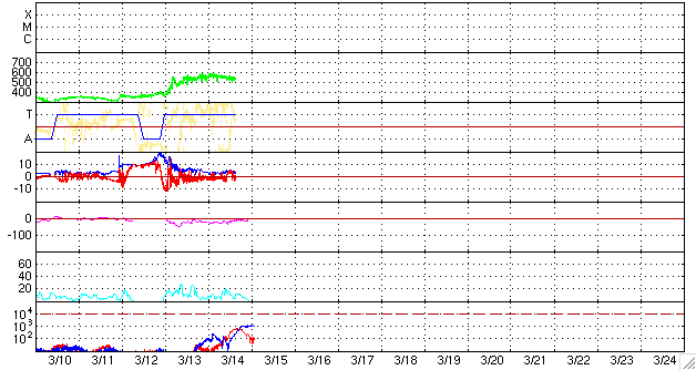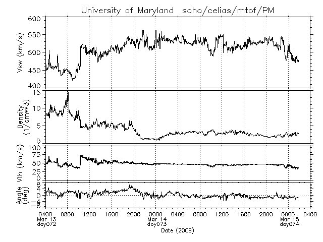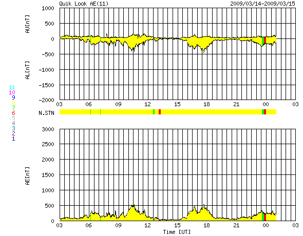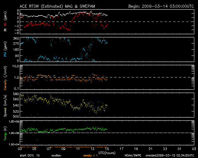 2009/ 3/15 11:34 更新 高速太陽風はゆっくりと速度が下がっています(470km/秒)。太陽に新しい黒点が現れている様です。 担当 篠原 高速の太陽風が続いているようです。 昨夜から、ACEのリアルタイムデータが止まっています。 昨夜の段階では、太陽風の速度は、530km/秒と高まった状態を保っていました。 代わりに、今日はSOHO衛星による太陽風のグラフを掲載します。 こちらを見ると、太陽風は今朝に入った頃からゆっくりと低下を始めていて、 現在、470km/秒ほどになっているようです。 高速太陽風は、前周期同様、比較的短い期間で終わりに向かっている様です。 AE指数によると、磁気圏活動は小規模の変化が続いています。 500nT程度の変動が、断続的に発生しています。 太陽風磁場の強度は既に3nTレベルに弱まっていますが、 弱いながらに南寄りの成分が頻繁に現れている様です。 高速太陽風は終わりに向かっていることから、 今後の磁気圏活動は更に小さくなり、静穏に戻って行くと思われます。 このまま太陽風の速度は一旦下がり、また5日ほど経った頃に、 小規模の乱れがやって来るのではないかと予想しています。 SOHO EIT195の太陽コロナ写真を見て下さい。 太陽の中心やや東側(左側)に、縦に伸びるコロナホールの影が見えます。 前周期よりもやや濃くなっている様で、太陽風がどう変化するか注目されます。 コロナホールが太陽の中心に来た頃に、前周期の写真と比較してみましょう。 SOHO EIT195では、太陽の中心に小さく明るく光っている領域があります。 ここを磁場写真で見ると、[白 黒]と小さな磁場の強まりがあります。 可視光写真では、かすかに黒点があるようです(NOAAの番号にはまだ入っていません)。 この領域は、太陽の南半球側にあります。 [白(N) 黒(S)]の磁場の順番は、南半球では、古い23活動周期の性質です。 磁場写真では、この領域の右となりにも、[白 黒]と並んだ小さな強まりが見えます。 その左下には、とても小さく、[黒 白]と並んだ領域も見えます。 こちらは、新しい24活動周期の順番です。 このあたりに、活動周期の境目があるということでしょうか。 放射線帯高エネルギー電子は、1000のレベルまで上昇しましたが、 大きな変化にはなりませんでした。 明日にかけてもう少し上がるかもしれませんが、 警戒レベルの10000までは行かないのではないでしょうか。 SOHO衛星による、太陽風データ。グラフは2日幅で、一番上が速度です。 (c) SOHO, Unin. of Maryland ![]() SOHO EIT195による、太陽コロナの様子。15日11時(世界時15日2時)。 (c) SOHO (ESA & NASA) ![]() SOHOによる太陽の磁場写真。中心付近の南半球側に、小さな磁場の強まりがあります。15日6時(世界時14日21時) (c) SOHO (ESA & NASA) ![]() SOHOによる太陽の可視光写真。中心やや東側に、小さな黒点が出現しているようです。15日6時(世界時14日21時)。 (c) SOHO (ESA & NASA) ![]() ACEが観測した太陽風の磁場(1番上の枠、白線は全体の強度、赤線は南北成分) および、太陽風の密度(3番目の橙線)、速度(4番目の黄線) (c) NOAA/SWPC ![]() リアルタイムAE指数 下段のAEグラフの値が高くなると、オーロラ活動が活発化しています。 (c) 京都大学, NICT ![]() シベリアで観測された3日間の磁場データ 右側の3分の1が、昨日のデータになります。グラフが上がったり下がったりすると、オーロラ活動が活発化しています。 (c) NICT ![]() 27日の太陽周期に合わせたデータプロット 太陽が同じ面を地球に向けていた27日前の変化から、今後を予想することができます。 (c) NICT