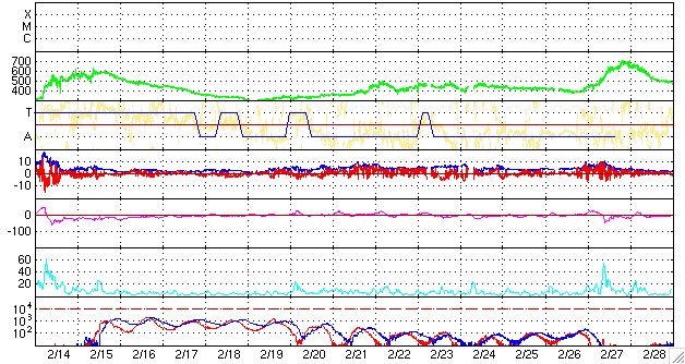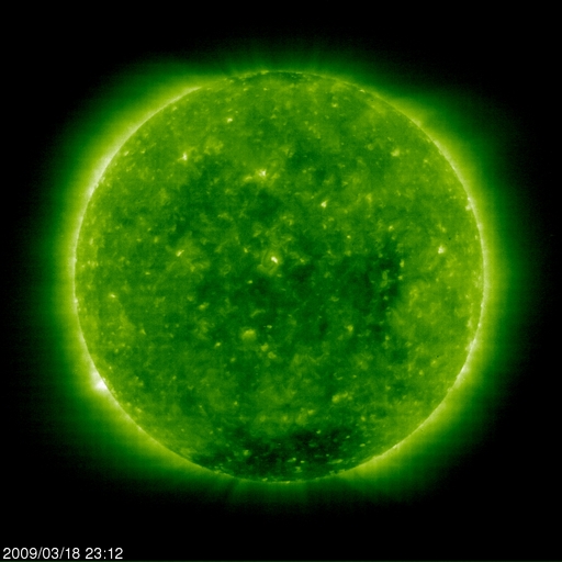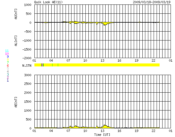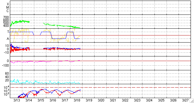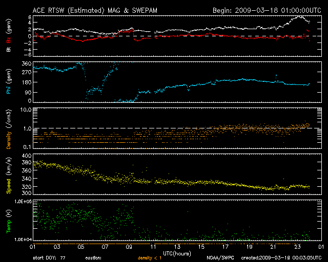 2009/ 3/19 09:03 更新 太陽風速度は320km/秒に下がり、低速で穏やかです。明日くらいから、弱い速度上昇が見られそうです。 担当 篠原 太陽風の速度は320km/秒へ更に下がり、低速風の傾向が強まっています。 磁場強度も2nTと弱まった状態が続きました。 このため、磁気圏はとても静穏です。 AE指数にはほとんど変化が見られません。 シベリア磁場データも、完全に平坦になっています。 ACEの磁場データは、最後のところで6nTに強まっています。 これから太陽風に変化が見られると予想されますが、 到来にはまだ早いのではないかと思います。 27日周期の図で前周期の変化を見ると、 太陽風速度の変動は2月22-24日にやって来ました。 速度は500km/秒弱までしか上がっておらず、規模の小さな乱れでした。 一方、この頃の磁場変化を見ると、 速度よりも早く、2月20日頃から小さな強まりを見せています。 現在見えている太陽風磁場の変化は、この強まりに対応するのかもしれません。 速度の上昇は、明日、20日か21日頃になるのではないかと思います。 前周期と一致することになるのかどうか、今後のACEのデータに注目して下さい。 太陽は無黒点で、静穏です。 SOHO EIT195による、太陽コロナの様子。19日8時(世界時18日23時)。 (c) SOHO (ESA & NASA) ![]() SOHOによる太陽の可視光写真。黒点はありません。19日7時半(世界時18日22時半) (c) SOHO (ESA & NASA) ![]() ACEが観測した太陽風の磁場(1番上の枠、白線は全体の強度、赤線は南北成分) および、太陽風の密度(3番目の橙線)、速度(4番目の黄線) (c) NOAA/SWPC ![]() リアルタイムAE指数 下段のAEグラフの値が高くなると、オーロラ活動が活発化しています。 (c) 京都大学, NICT ![]() シベリアで観測された3日間の磁場データ 右側の3分の1が、昨日のデータになります。グラフが上がったり下がったりすると、オーロラ活動が活発化しています。 (c) NICT ![]() 27日の太陽周期に合わせたデータプロット 太陽が同じ面を地球に向けていた27日前の変化から、今後を予想することができます。 (c) NICT