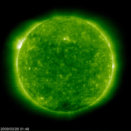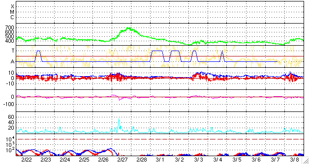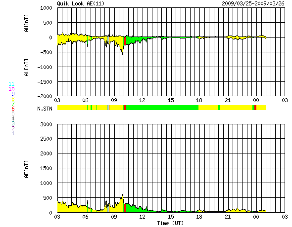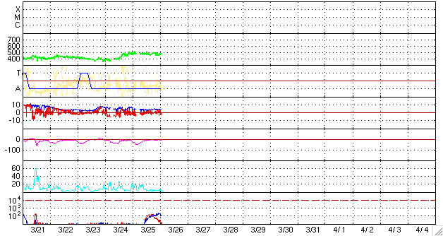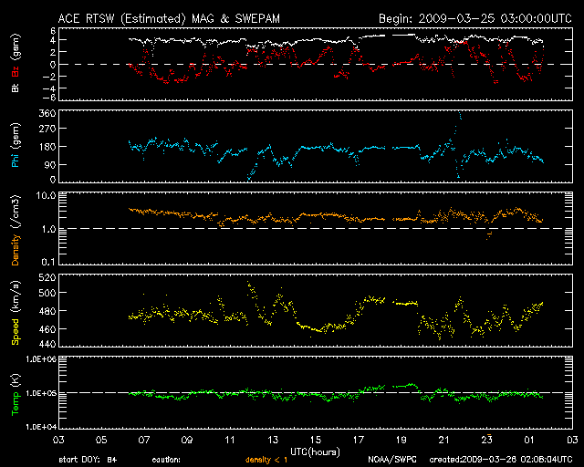 2009/ 3/26 11:09 更新 太陽風は、480km/秒の高速状態で安定しています。小規模のオーロラ活動も発生しています。 担当 篠原 昨日、480km/秒に高まっていた太陽風の速度は、 現在まで480km/秒でほぼ安定しています。 磁場強度は、既に4nTに落ち着いています。 磁場の南北成分は、南や北にゆっくりと変化していて、 これに対応して、小規模のオーロラ活動がAE指数で観測されています。 さて、この後の太陽風の変化ですが、 前周期の2月27-28日に見られた変化が、今日から明日にかけて回帰する可能性があります。 27日周期の図の前周期の変化を見ると、いつも通り、初めに磁場強度が高まり、 続いて、速度が変化しています。 この辺りを頭に入れながら、これからのACEのデータに注目してください。 いまのところ、太陽風の磁場強度に変化は見られず、様子見というところです。 太陽は無黒点が続いています。 SOHO EIT196の太陽の東端(左端)を見ると、向こう側に活動領域があるようです。 さて、ここに黒点はあるでしょうか。 GOESのX線データが、この領域の影響でレベルが上がっています。 SOHO EIT195による、太陽コロナの様子。26日11時(世界時26日2時)。 (c) SOHO (ESA & NASA) ![]() ACEが観測した太陽風の磁場(1番上の枠、白線は全体の強度、赤線は南北成分) および、太陽風の密度(3番目の橙線)、速度(4番目の黄線) (c) NOAA/SWPC ![]() リアルタイムAE指数 下段のAEグラフの値が高くなると、オーロラ活動が活発化しています。 (c) 京都大学, NICT ![]() シベリアで観測された3日間の磁場データ 右側の3分の1が、昨日のデータになります。グラフが上がったり下がったりすると、オーロラ活動が活発化しています。 (c) NICT ![]() 27日の太陽周期に合わせたデータプロット 太陽が同じ面を地球に向けていた27日前の変化から、今後を予想することができます。 (c) NICT