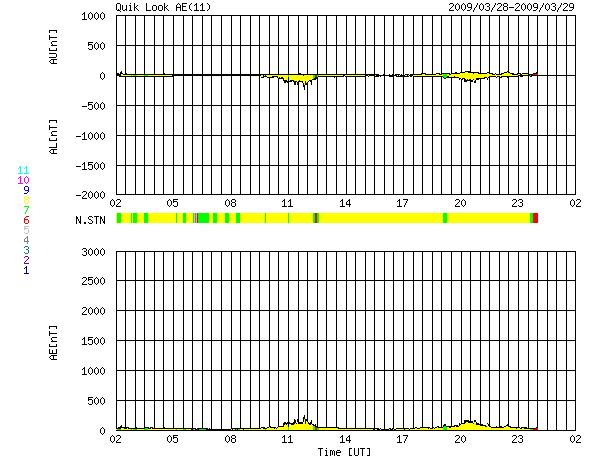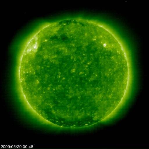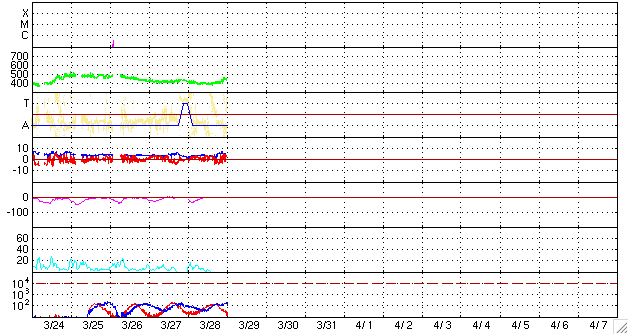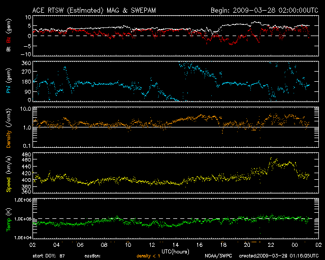 2009/ 3/29 10:16 更新 400km/秒付近の穏やかな太陽風が続いています。太陽は無黒点です。 担当 篠原 平均的な数値の太陽風が続いています。 速度は400km/秒、磁場強度は5nTほどで安定しています。 磁気圏活動はかなり静穏です。 AE指数には、ごく小さな変化がふたつ発生しているだけです。 太陽風磁場の南北成分が、比較的北寄りで推移しているためでしょう。 穏やかな太陽風は、まだ10日以上続くと予想されます。 今日の27日周期の図でも、次の高速風はまだ出てきていません。 SOHO EIT195の太陽コロナ写真では、 北極付近や、南極にはコロナホールが見えていますが、 地球へ影響を最も及ぼす低緯度域は、全体的に一様で、 コロナホールなどの構造は見られません。 この写真を見ても、穏やかな太陽風が続きそうです。 この写真の北半球(上半分)の東端(左端)の明るい活動領域が、 こちら側に移動して見やすくなっています。 可視光写真で調べると、やはり黒点は無かったようです。 この部分は、白く、白斑が光っています。 SOHO EIT195による、太陽コロナの様子。29日10時(世界時29日1時)。 (c) SOHO (ESA & NASA) ![]() SOHOによる太陽の可視光写真。黒点はありませんが、白斑が見えます。29日7時半(世界時28日22時半)。 (c) SOHO (ESA & NASA) ![]() ACEが観測した太陽風の磁場(1番上の枠、白線は全体の強度、赤線は南北成分) および、太陽風の密度(3番目の橙線)、速度(4番目の黄線) (c) NOAA/SWPC ![]() リアルタイムAE指数 下段のAEグラフの値が高くなると、オーロラ活動が活発化しています。 (c) 京都大学, NICT ![]() シベリアで観測された3日間の磁場データ 右側の3分の1が、昨日のデータになります。グラフが上がったり下がったりすると、オーロラ活動が活発化しています。 (c) NICT ![]() 27日の太陽周期に合わせたデータプロット 太陽が同じ面を地球に向けていた27日前の変化から、今後を予想することができます。 (c) NICT
