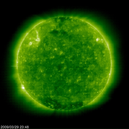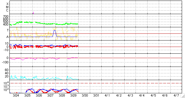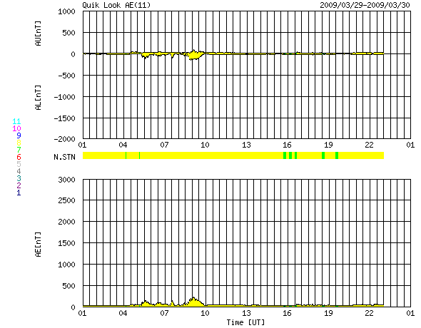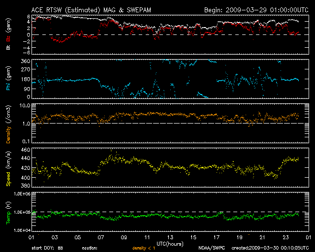 2009/ 3/30 09:10 更新 420km/秒の穏やかな太陽風が続いています。磁気圏も静穏です。 担当 篠原 速度420km/秒で安定した太陽風が続いています。 磁場強度も、4nTを前後していて、通常の強度です。 今日の太陽風磁場の南北成分は、北寄りが続いていました。 このため、磁気圏活動はほとんどなく、 AE指数のグラフはとても静かになっています。 この落ち着いた状態は、まだ10日程度続くと見込まれます。 27日周期の図を見ると、前周期の3月3-4日に、 太陽風磁場の一時的な強まりが発生しています。 速度には目立った変化はなかったのですが、 この変化が回帰してくるのかどうか、この後の太陽風の変化と見比べてください。 SOHO EIT195を見ると、東端(左端)の南半球(下)側に、小さな明るい点があります。 まだ、太陽の向こう側にあるのですが、STEREO Behindで先回りをすると、 小さいものの、明るくまとまった光り方をしています。 もしかすると、小さな黒点があるのかもしれません。 明日にはこちら側に回って来るでしょう。 更に、この光点に続いて、コロナホールがこちら側に回って来ます。 10日後以降の高速風の原因となる領域です。 SOHO EIT195による、太陽コロナの様子。30日9時(世界時30日0時)。 (c) SOHO (ESA & NASA) ![]() SOHOによる太陽の可視光写真。黒点はありません。30日6時(世界時29日21時)。 (c) SOHO (ESA & NASA) ![]() ACEが観測した太陽風の磁場(1番上の枠、白線は全体の強度、赤線は南北成分) および、太陽風の密度(3番目の橙線)、速度(4番目の黄線) (c) NOAA/SWPC ![]() リアルタイムAE指数 下段のAEグラフの値が高くなると、オーロラ活動が活発化しています。 (c) 京都大学, NICT ![]() シベリアで観測された3日間の磁場データ 右側の3分の1が、昨日のデータになります。グラフが上がったり下がったりすると、オーロラ活動が活発化しています。 (c) NICT ![]() 27日の太陽周期に合わせたデータプロット 太陽が同じ面を地球に向けていた27日前の変化から、今後を予想することができます。 (c) NICT