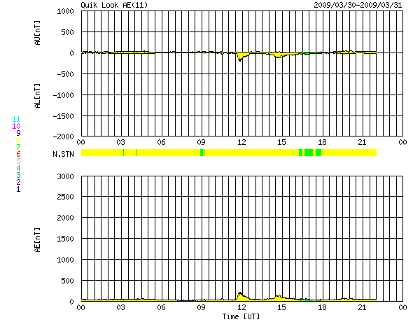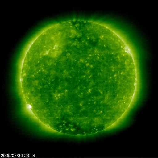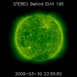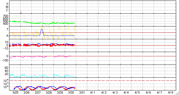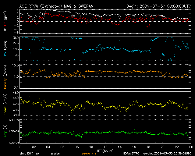 2009/ 3/31 08:39 更新 太陽風速度は、420km/秒で安定し、穏やかな状態が続いています。 担当 篠原 太陽風は、速度が420km/秒で安定しています。 ACEの図では、縦幅が拡大されているため、速度が変化しているようにも見えますが、 27日周期の図を見ると、ここ4日ほど、ほとんど同じ速度が続いていることが分かります。 磁場強度は、4nTから2nTへ弱まり、とても穏やかです。 磁気圏活動もとても静かです。 AE指数には、ほとんど変化が見られません。 シベリア磁場データも、3日間にわたって、ほとんど平坦な状態です。 穏やかな太陽風は、まだまだ続きます。 今日の27日周期の図でも、前周期のグラフに次の高速風は顔を出していません。 前周期は、3月13日に高速風が始まりました。 今周期は、4月9日頃になると予想されます。 SOHO EIT195では、その高速風の発生源であるコロナホールはまだ見えていません。 そこで、STEREO Behindで先回りしてみましょう。 今日2枚目の小さな太陽写真は、STEREO Behindによる太陽コロナです。 この写真では、太陽の東端(左端)にコロナホールの薄暗い影が見えています。 STEREO Behindは、地球よりも3日半ほど先の太陽を見ています。 SOHOでも、このコロナホールが次第に見えるようになるでしょう。 SOHO EIT195では、南東(左下)の明るい領域がこちら側に回って来ています。 可視光写真では、白斑が見えていますが、黒点の姿はありませんでした。 太陽は無黒点が続いています。 SOHO EIT195による、太陽コロナの様子。31日8時半(世界時30日23時半)。 (c) SOHO (ESA & NASA) ![]() STEREO Behind衛星による、太陽コロナ写真。31日8時(世界時30日23時)。 (c) NASA ![]() SOHOによる太陽の可視光写真。黒点はありません。31日6時(世界時30日21時)。 (c) SOHO (ESA & NASA) ![]() ACEが観測した太陽風の磁場(1番上の枠、白線は全体の強度、赤線は南北成分) および、太陽風の密度(3番目の橙線)、速度(4番目の黄線) (c) NOAA/SWPC ![]() リアルタイムAE指数 下段のAEグラフの値が高くなると、オーロラ活動が活発化しています。 (c) 京都大学, NICT ![]() シベリアで観測された3日間の磁場データ 右側の3分の1が、昨日のデータになります。グラフが上がったり下がったりすると、オーロラ活動が活発化しています。 (c) NICT ![]() 27日の太陽周期に合わせたデータプロット 太陽が同じ面を地球に向けていた27日前の変化から、今後を予想することができます。 (c) NICT