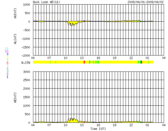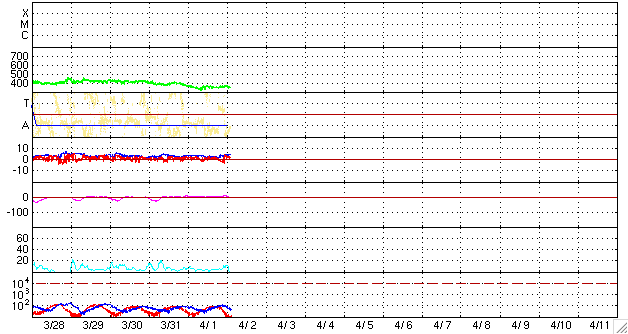 ACEが観測した太陽風の磁場(1番上の枠、白線は全体の強度、赤線は南北成分) および、太陽風の密度(3番目の橙線)、速度(4番目の黄線) (c) NOAA/SWPC ![]() リアルタイムAE指数 下段のAEグラフの値が高くなると、オーロラ活動が活発化しています。 (c) 京都大学, NICT ![]() シベリアで観測された3日間の磁場データ 右側の3分の1が、昨日のデータになります。グラフが上がったり下がったりすると、オーロラ活動が活発化しています。 (c) NICT ![]() 27日の太陽周期に合わせたデータプロット 太陽が同じ面を地球に向けていた27日前の変化から、今後を予想することができます。 (c) NICT