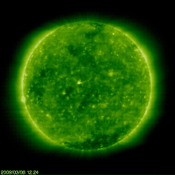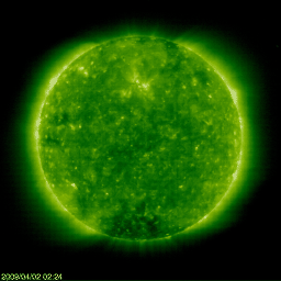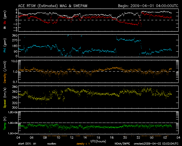 2009/ 4/ 2 12:02 更新 太陽風速度は35km/秒に下がり、低速風になりました。磁気圏も静かです。 担当 篠原 太陽風の速度は350km/秒まで下がり、低速風に変わりました。 磁場強度は、2〜4nTとやや弱まったままです。 磁気圏活動もほとんど見られません。 AE指数では、200nTほどの小さな変化が一度起きただけです。 穏やかな太陽風は、今後も1週間程度続きます。 今日は、SOHO EIT195の太陽コロナ写真を、 現在(左)と27日前(右)とで比較してみましょう。 すると、27日前の太陽(右)では、小さなコロナホールがあちこちに見えていましたが、 現在の写真(左)では、それらの小さなコロナホールはほとんど消えています。 南極には、どちらも大きなコロナホールが広がっていますが、 その形も、現在の写真の方が低緯度側にせり出していて、ゆっくりと変化している様です。 太陽の東端(左端)に目を向けると、 1週間後に高速風をもたらすコロナホールが姿を見せています。 しかし、その様子も変化しています。 27日前の写真(右)では、コロナホールの姿が既に見えていますが、 現在の写真(左)では、まだ見にくい位置にあります。 STEREO Behindで先回りして比較すると、 コロナホールが少し向こう側へ移動している様です。 すると、高速風の始まりや強度も変わっている可能性があります。 コロナホールは、もう2〜3日するとはっきり見えて来ます。 その時点で、再び検討してみましょう。 太陽は無黒点のままです。 SIDCの発表によると、3月の無黒点日数は28日に達しました。 静かな太陽が続いています。 SOHO衛星のEIT195カメラの映像 (c) SOHO (ESA & NASA)