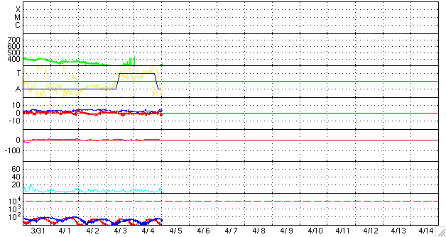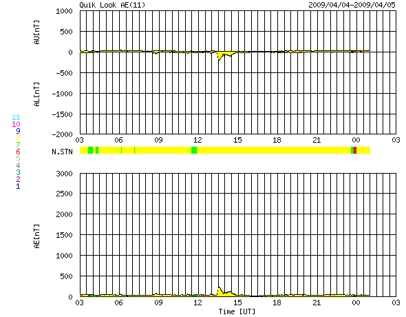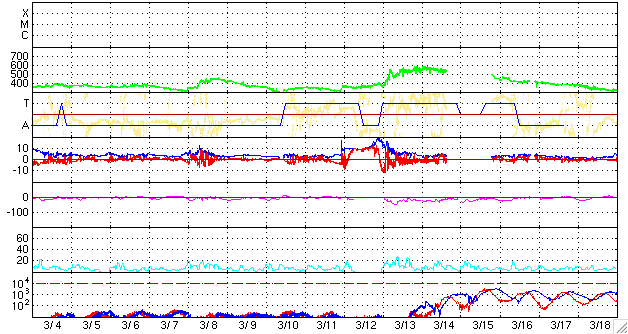 ACEが観測した太陽風の磁場(1番上の枠、白線は全体の強度、赤線は南北成分) および、太陽風の密度(3番目の橙線)、速度(4番目の黄線) (c) NOAA/SWPC ![]() リアルタイムAE指数 下段のAEグラフの値が高くなると、オーロラ活動が活発化しています。 (c) 京都大学, NICT ![]() シベリアで観測された3日間の磁場データ 右側の3分の1が、昨日のデータになります。グラフが上がったり下がったりすると、オーロラ活動が活発化しています。 (c) NICT ![]() 27日の太陽周期に合わせたデータプロット 太陽が同じ面を地球に向けていた27日前の変化から、今後を予想することができます。 (c) NICT