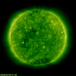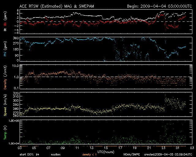 2009/ 4/ 5 11:06 更新 とても速度の遅い、穏やかな太陽風が続いています。磁気圏も静かです。 担当 篠原 太陽風は、速度280km/秒とかなり低速の状態が続いています。 磁場強度も、2-4nTと弱めのまま推移しています。 太陽風が穏やかなため、磁気圏活動も穏やかです。 AE指数はほとんど変化していません。 昨日、小規模の速度の盛り上がりが回帰するかもとしていましたが、 それに対応する変化は全く見られませんでした。 穏やかな状態は、もう4日ほど続くと予想しています。 SOHO EIT195による太陽コロナを見て下さい。 左の写真が現在の太陽、右はちょうど1回転前の27日前の太陽です。 左の写真では、太陽のまん中東寄り(左寄り)に、大きなコロナホールが見えます。 もうしばらくすると、先端(右端)が太陽の中心線に達します。 すると、それから3日後くらいに高速太陽風が地球までやってくるのです。 続いて、2枚の写真を見比べて下さい。 コロナホールの様子は、大きくは変わっていない様です。 細かく見ると、縦にやや長くなり、幅はやや狭まっているようです。 コロナホールの分布に大きな変化がないということは、 これからやってくる高速太陽風もまた、 前周期の変化と似たものになるだろうと予想することができます。 そこで、27日周期の図を見ると、前周期の高速風は、 3月13日に始まり、最高速度は570km/秒ほど、高速風は3日間続きました。 今周期も、4月9日以降に同様の変化がやって来るのではないかと考えられます。 さて、実際にはどうなるでしょうか? 太陽は無黒点のままです。 STEREO衛星で太陽の左右を見渡しても、活動的な領域は見られません。 SOHO衛星のEIT195カメラの映像 (c) SOHO (ESA & NASA)