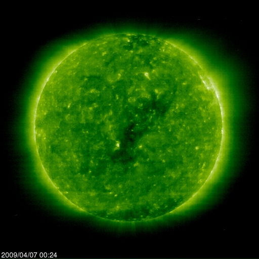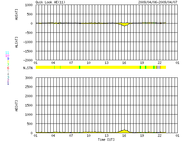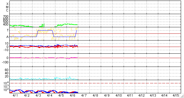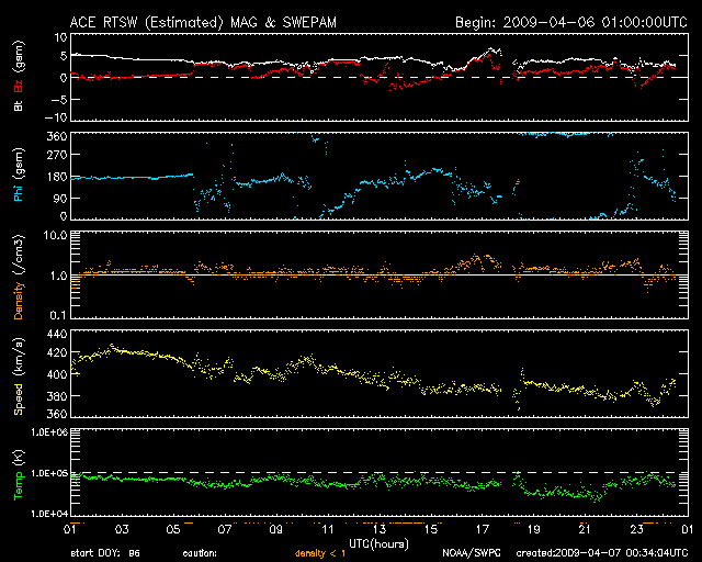 2009/ 4/ 7 09:35 更新 太陽風は400km/秒前後で安定しています。明日までは穏やかに推移しそうです。 担当 篠原 太陽風は、420km/秒から、380km/秒へゆっくりと変化しつつ、 穏やかな状態を保っています。 磁場強度も、4-5nTで安定しています。 磁気圏もとても静かです。 AE指数には、小さな変化がひとつ見えるだけで、他の時間帯は完全に平らです。 こちらも、10日間にわたって、ほとんど活動の無い状態が続いています。 本当に静かな宇宙天気が続いていますが、 もう2日程度はこの状態が続きそうです。 次の高速太陽風の到来は、9日になるだろうと思われます。 SOHO EIT195では、コロナホールが太陽の中心に来ています。 高速の太陽風が、地球に向かって飛び出しているところです。 太陽の活動も静穏です。 黒点の無い状態が続いています。 SOHO EIT195による、太陽コロナの様子。7日9時半(世界時7日0時半)。 (c) SOHO (ESA & NASA) ![]() ACEが観測した太陽風の磁場(1番上の枠、白線は全体の強度、赤線は南北成分) および、太陽風の密度(3番目の橙線)、速度(4番目の黄線) (c) NOAA/SWPC ![]() リアルタイムAE指数 下段のAEグラフの値が高くなると、オーロラ活動が活発化しています。 (c) 京都大学, NICT ![]() シベリアで観測された3日間の磁場データ 右側の3分の1が、昨日のデータになります。グラフが上がったり下がったりすると、オーロラ活動が活発化しています。 (c) NICT ![]() 27日の太陽周期に合わせたデータプロット 太陽が同じ面を地球に向けていた27日前の変化から、今後を予想することができます。 (c) NICT
