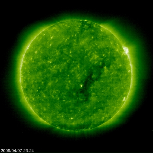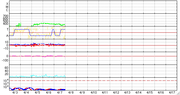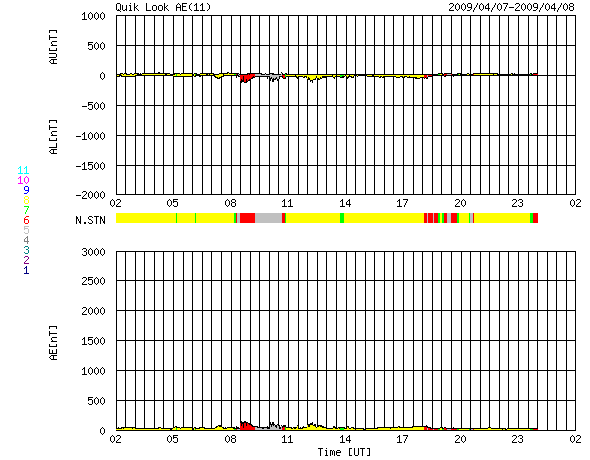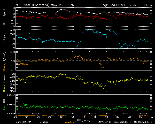 2009/ 4/ 8 10:19 更新 やや低速の穏やかな太陽風が続いています。明日くらいから、高速太陽風が始まりそうです。 担当 篠原 やや低速の穏やかな太陽風が続いています。 昨日、380km/秒へ下がった太陽風の速度は、その後も360〜380km/秒で推移しています。 磁場強度は2nTへ弱まっていて、太陽風は一段と穏やかです。 このため、磁気圏もたいへん静かです。 AE指数は、ほとんど変化していません。 穏やかな状態は今日いっぱい続き、明日からは、高速の太陽風がやって来そうです。 SOHO EIT195の太陽コロナ写真を見て下さい。 コロナホールは、太陽の西半球(右側)に移動し、 次第に地球への影響開始位置(見かけの位置です)に近づいています。 コロナホールの先頭(右端)が、太陽の西側半球のまん中くらいに達した頃、 地球に高速の太陽風がやって来ます。 高速風到来のタイミングは、27日周期の図でも予想できます。 前周期は、3月13日に入った頃に、太陽風の速度が上昇しています。 この図は世界時で表示していますので、日本時間には9時間を足して下さい。 すると、今周期は、4月9日の午前中に高速風が始まると予想できます。 27日周期予想は、タイミングが1日程度前後することはよくありますので、 今後のACEのデータに注目していて下さい。 太陽は、無黒点の静かな状態が続いています。 SOHO EIT195による、太陽コロナの様子。8日8時半(世界時7日23時半)。 (c) SOHO (ESA & NASA) ![]() ACEが観測した太陽風の磁場(1番上の枠、白線は全体の強度、赤線は南北成分) および、太陽風の密度(3番目の橙線)、速度(4番目の黄線) (c) NOAA/SWPC ![]() リアルタイムAE指数 下段のAEグラフの値が高くなると、オーロラ活動が活発化しています。 (c) 京都大学, NICT ![]() シベリアで観測された3日間の磁場データ 右側の3分の1が、昨日のデータになります。グラフが上がったり下がったりすると、オーロラ活動が活発化しています。 (c) NICT ![]() 27日の太陽周期に合わせたデータプロット 太陽が同じ面を地球に向けていた27日前の変化から、今後を予想することができます。 (c) NICT