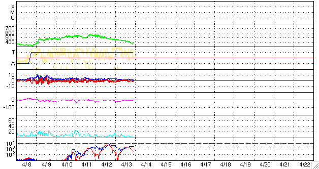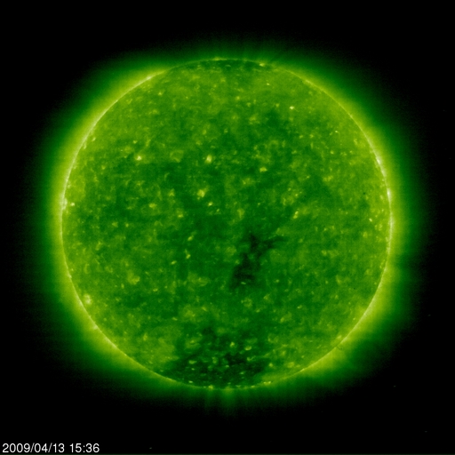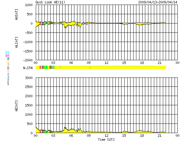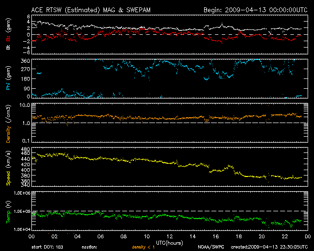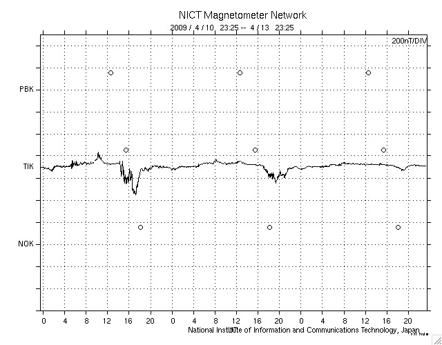 2009/ 4/14 08:30 更新 太陽風は低速になり(370km/秒)、穏やかです。明日までは静かでしょう。 担当 篠原 太陽風の速度は引き続き低下して、 今朝の段階で400km/秒を割り、370km/秒と低速の太陽風に変わっています。 磁場強度も2nTと弱まっています。 穏やかな太陽風になりました。 このため、磁気圏のオーロラ活動も静穏です。 AE指数で、300nt以下の小さな変化が数回見られる程度です。 穏やかな状態は、明日までは続くでしょう。 その後、16日か17日に再び太陽風の速度が上昇します。 発生源のコロナホールは、既に太陽の中心部を通過し、西半球側に見えています。 もう2日ほどすると、見かけ上の影響開始位置に達します。 27日周期の図を見ると、前周期のこの期間、3月20-21日の太陽風は、 速度と磁場強度が多少盛り上がっていますが、 高速風というほどではありませんでした。 今回はコロナホールもはっきりと見える様になり、 500km/秒台の風がやって来るかもしれません。 放射線帯高エネルギー電子の増加は止まりました。 警戒レベルより下の、数千くらいで変化は止まっています。 今後はゆっくりと減少して行くでしょう。 太陽は今日も無黒点です。 STEREO衛星で左右を見渡しても明るい領域は全く見られず、 静かな太陽が続いています。 SOHO EIT195による、太陽コロナの様子。14日0時半(世界時13日15時半)。 (c) SOHO (ESA & NASA) ![]() ACEが観測した太陽風の磁場(1番上の枠、白線は全体の強度、赤線は南北成分) および、太陽風の密度(3番目の橙線)、速度(4番目の黄線) (c) NOAA/SWPC ![]() リアルタイムAE指数 下段のAEグラフの値が高くなると、オーロラ活動が活発化しています。 (c) 京都大学, NICT ![]() シベリアで観測された3日間の磁場データ 右側の3分の1が、昨日のデータになります。グラフが上がったり下がったりすると、オーロラ活動が活発化しています。 (c) NICT ![]() 27日の太陽周期に合わせたデータプロット 太陽が同じ面を地球に向けていた27日前の変化から、今後を予想することができます。 (c) NICT