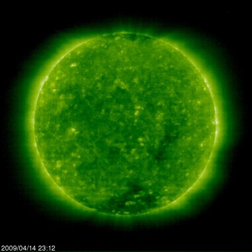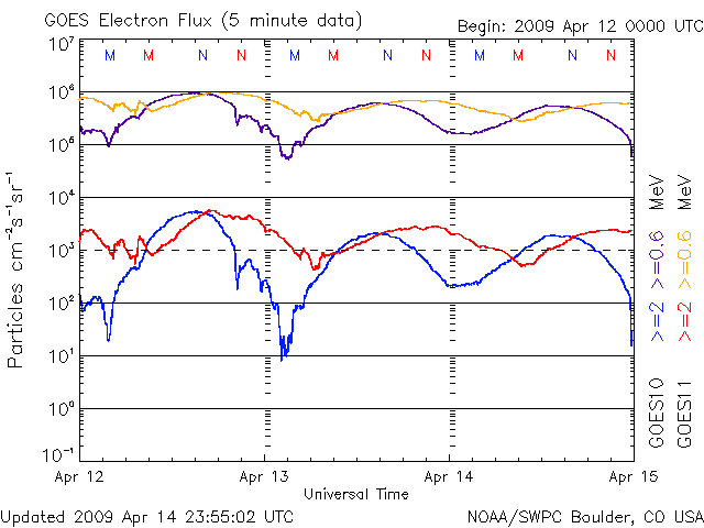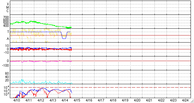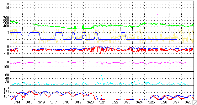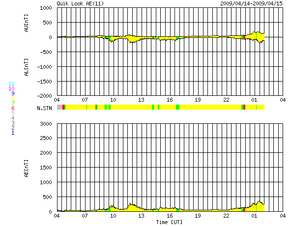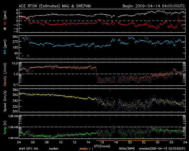 2009/ 4/15 12:53 更新 330km/秒の遅い太陽風になっています。明日以降、高速風が来そうです。 担当 篠原 太陽風の速度は、更に下がって330km/秒となっています。 かなり低速の状態です。 一方、磁場強度は、2nTから4nTへと強度を回復しています。 太陽風磁場の南北成分が、-2nTと弱いながらもずっと南を向いています。 しかし、速度がとても遅いため、AE指数は変化しているものの、 200nT前後の小さなものばかりです。 ただし、このあたりは、AE指数の観測網の限界もあって、 今日のような穏やかな太陽風の時は、普段よりも高緯度側で活動が起きていて、 グラフには見えないのかもしれません。 太陽風は、今日いっぱいは穏やかに過ぎて行くでしょう。 そして、明日か明後日になると、高速の太陽風がやって来ると予想しています。 発生源のコロナホールは西に片寄り、影響開始位置に近づいています。 太陽風の乱れは、それほど大きな変化にはならないと思いますが、 前周期はほとんど見られなかったので、今回どうなるか注目しています。 放射線帯高エネルギー電子は、大きくレベルを下げています。 太陽風磁場の南向きが影響した様です。 太陽は無黒点が続いています。 磁場写真を見てもほとんどむらが無く、今日も平坦な太陽です。 SOHO EIT195による、太陽コロナの様子。15日8時(世界時14日23時)。 (c) SOHO (ESA & NASA) ![]() ACEが観測した太陽風の磁場(1番上の枠、白線は全体の強度、赤線は南北成分) および、太陽風の密度(3番目の橙線)、速度(4番目の黄線) (c) NOAA/SWPC ![]() リアルタイムAE指数 下段のAEグラフの値が高くなると、オーロラ活動が活発化しています。 (c) 京都大学, NICT ![]() シベリアで観測された3日間の磁場データ 右側の3分の1が、昨日のデータになります。グラフが上がったり下がったりすると、オーロラ活動が活発化しています。 (c) NICT ![]() 27日の太陽周期に合わせたデータプロット 太陽が同じ面を地球に向けていた27日前の変化から、今後を予想することができます。 (c) NICT