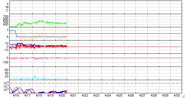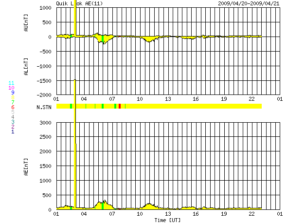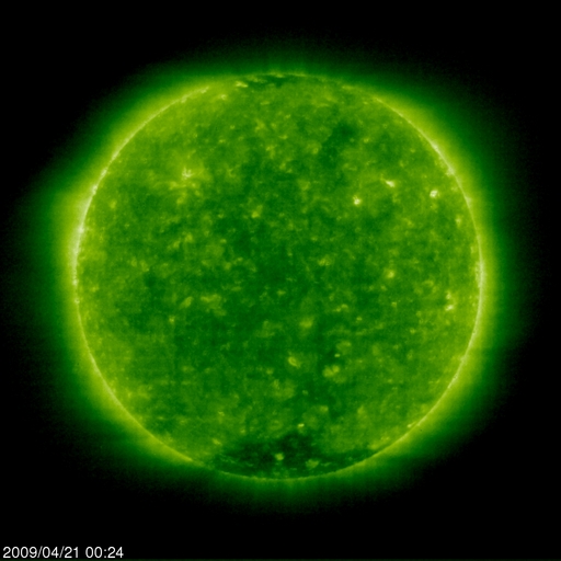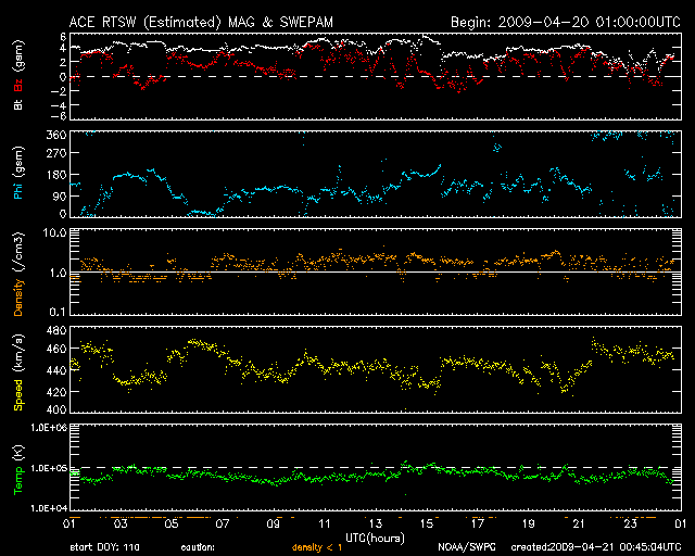 2009/ 4/21 09:45 更新 速度440km/秒で安定した太陽風が続いています。磁気圏は概ね静穏です。 担当 篠原 太陽風の速度は、昨日より440km/秒前後で安定しています。 平均的な速度よりも、少し高まったくらいの速度です。 磁場強度も、4nTを前後していて、こちらも平均的な強さで安定しています。 前周期に見られた小さな速度の盛り上がり(27日周期の図参照)は、 まだ見られません。 今周期も来るのかどうか、もうしばらく様子を見る必要があるでしょう。 磁気圏は概ね静穏です。 AE指数で200nTくらいの小さな変動が、2回ほど見られています。 SOHO EIT195の太陽コロナは、全体的にぼんやりと光っていて、 コロナホールや活動領域などの目立った構造は見られません。 穏やかな太陽風は、まだまだ続きそうです。 前周期の次の高速風は、4月9日に来ました。 その回帰は、5月6日頃と考えられるので、 それまで特に変化が見られない場合、 これから15日間も穏やかな太陽風が続くことになります。 太陽は無黒点が続いています。 連続記録は25日になりました。 SOHO EIT195による、太陽コロナの様子。21日9時半(世界時21日0時半)。 (c) SOHO (ESA & NASA) ![]() ACEが観測した太陽風の磁場(1番上の枠、白線は全体の強度、赤線は南北成分) および、太陽風の密度(3番目の橙線)、速度(4番目の黄線) (c) NOAA/SWPC ![]() リアルタイムAE指数 下段のAEグラフの値が高くなると、オーロラ活動が活発化しています。 (c) 京都大学, NICT ![]() シベリアで観測された3日間の磁場データ 右側の3分の1が、昨日のデータになります。グラフが上がったり下がったりすると、オーロラ活動が活発化しています。 (c) NICT ![]() 27日の太陽周期に合わせたデータプロット 太陽が同じ面を地球に向けていた27日前の変化から、今後を予想することができます。 (c) NICT