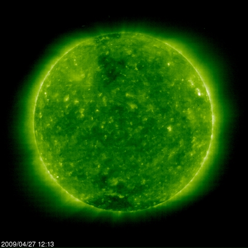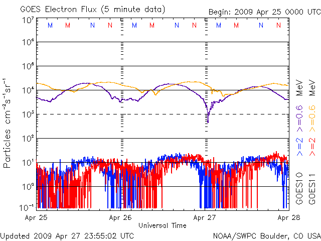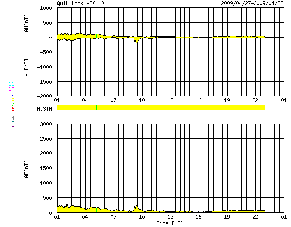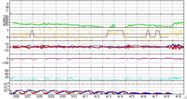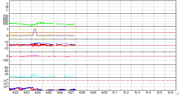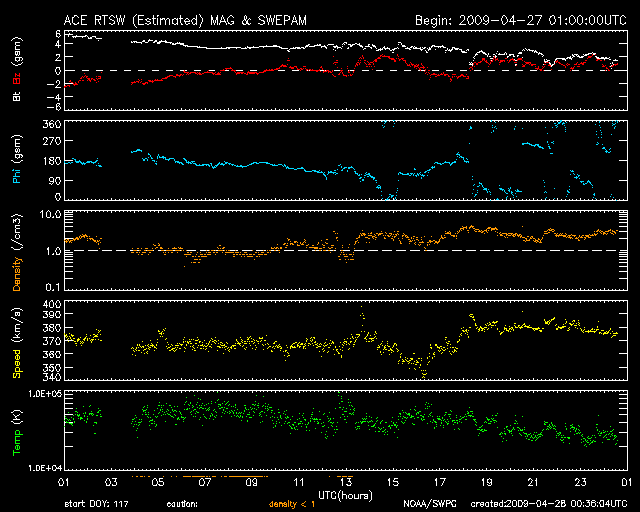 2009/ 4/28 09:37 更新 380km/秒のやや低速の太陽風が、穏やかに続いています。磁気圏も静穏です。 担当 篠原 穏やかな太陽風が続いています。 速度は、昨日からほどんど変わらず、370〜380km/秒とやや低速で安定しています。 磁場強度は、5nTから3nTへ弱まっています。 磁気圏活動もとても静かです。 太陽風磁場の弱い南向きの影響で、AE指数の前半には小さな変化が見られますが、 南向き磁場が終わるとともに、AE指数の後半は完全に静かになっています。 SOHO EIT195を見ると、太陽の北半球高緯度寄りにコロナホールが現れています。 これは、前周期には見られなかったものです。 緯度が高いため、地球へ影響は及びにくいと思われますが、 3日後の、5月1-2日頃の太陽風に変化が見られるかもしれません。 それがなければ、5月5日頃まで静かな太陽風が続くでしょう。 太陽は、無黒点が続いています。 SOHO EIT195による、太陽コロナの様子。27日21時(世界時27日12時)。 (c) SOHO (ESA & NASA) ![]() ACEが観測した太陽風の磁場(1番上の枠、白線は全体の強度、赤線は南北成分) および、太陽風の密度(3番目の橙線)、速度(4番目の黄線) (c) NOAA/SWPC ![]() リアルタイムAE指数 下段のAEグラフの値が高くなると、オーロラ活動が活発化しています。 (c) 京都大学, NICT ![]() シベリアで観測された3日間の磁場データ 右側の3分の1が、昨日のデータになります。グラフが上がったり下がったりすると、オーロラ活動が活発化しています。 (c) NICT ![]() 27日の太陽周期に合わせたデータプロット 太陽が同じ面を地球に向けていた27日前の変化から、今後を予想することができます。 (c) NICT