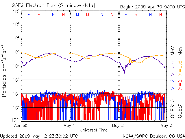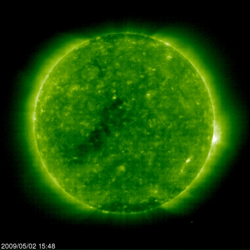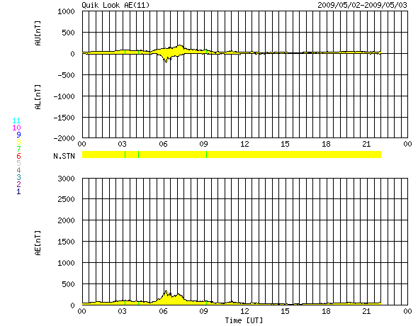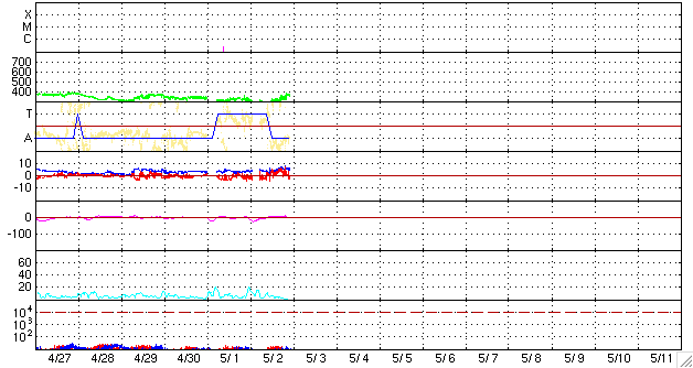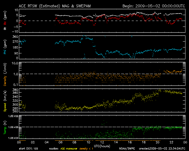 2009/ 5/ 3 08:35 更新 300km/秒台の低速の太陽風が続いています。磁気圏も静穏です。 担当 篠原 今日は、マニラより更新しています。 昨日のニュースの後、太陽風の速度は、280km/秒まで下がりました。 そして、昨夜からはじわじわと上昇を始め、現在、360km/秒になっています。 いずれも低速風の範囲の中の変化で、穏やかな太陽風が続いています。 磁気圏も静穏です。 AE指数は、ほとんど変化していません。 EIT195では、コロナホールが太陽の中心線に達しつつあります。 これから3日後くらいに高速風が地球までやってきますから、 5月6日ころの回帰となりそうです。 前周期は、最高速度が550km/秒程度、高速風は4日ほど続きました。 太陽は無黒点です。 1016黒点群の領域は、太陽の向こう側に行ってしまいました。 GOESのX線データには、少し時間幅を持ったAクラスのフレアが観測されています。 向こう側へ回った1016群の領域で発生したと思われますが、 こちら側に残っていれば、もう少し規模の大きな現象として見えていたかもしれません。 SOHO EIT195による、太陽コロナの様子。3日1時(世界時2日16時)。 (c) SOHO (ESA & NASA) ![]() ACEが観測した太陽風の磁場(1番上の枠、白線は全体の強度、赤線は南北成分) および、太陽風の密度(3番目の橙線)、速度(4番目の黄線) (c) NOAA/SWPC ![]() リアルタイムAE指数 下段のAEグラフの値が高くなると、オーロラ活動が活発化しています。 (c) 京都大学, NICT ![]() シベリアで観測された3日間の磁場データ 右側の3分の1が、昨日のデータになります。グラフが上がったり下がったりすると、オーロラ活動が活発化しています。 (c) NICT ![]() 27日の太陽周期に合わせたデータプロット 太陽が同じ面を地球に向けていた27日前の変化から、今後を予想することができます。 (c) NICT