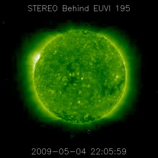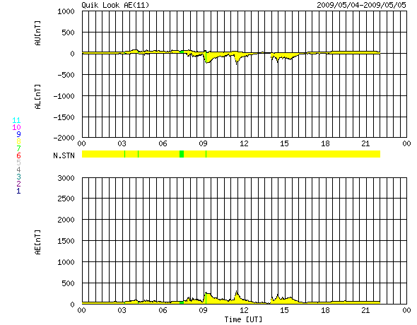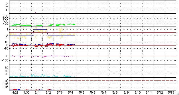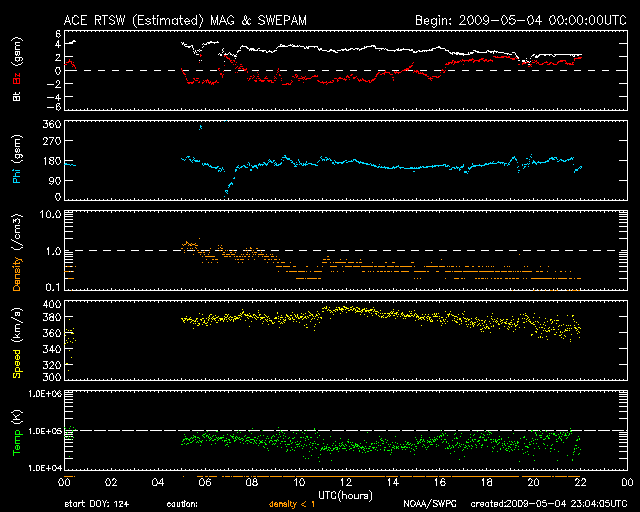 2009/ 5/ 5 08:05 更新 380km/秒ほどの穏やかな太陽風が続いています。明日くらいから高速風が始まりそうです。 担当 篠原 太陽風は、速度が360〜380km/秒とやや低速で安定しています。 磁場強度は、4nTから2nTへ下がり、弱まっています。 穏やかな太陽風は、今日も続くでしょう。 AE指数を見ると、小さな活動が3回ほど発生しています。 太陽風の速度は昨日とほとんど変わっていないのですが、 AE指数のグラフは、小さいながらも変化が見られました。 これは、太陽風磁場の南北成分が、 -2nTと弱いながらも南寄りになっていたためでしょう。 今日も穏やかな太陽風が続き、明日くらいから高速風が始まりそうです。 27日周期の図で、4月9日に始まっている高速風の回帰です。 SOHOの写真が止まっているので、今日もSTEREOの写真を掲載します。 地球よりも3日半ほど先を行っているため、 コロナホールはもうかなり通り過ぎています。 太陽の可視光写真も更新されていないのですが、 STEREOの写真を参考にすると、黒点は現れていないだろうと思われます。 今日はこれから帰国です。 簡単な更新で申し訳ありません。 STEREO Behindによる太陽コロナの写真。衛星の位置の関係で、地球よりも3日半ほど先の太陽を見ています。5月5日7時(世界時4日22時) (c) NASA ![]() ACEが観測した太陽風の磁場(1番上の枠、白線は全体の強度、赤線は南北成分) および、太陽風の密度(3番目の橙線)、速度(4番目の黄線) (c) NOAA/SWPC ![]() リアルタイムAE指数 下段のAEグラフの値が高くなると、オーロラ活動が活発化しています。 (c) 京都大学, NICT ![]() シベリアで観測された3日間の磁場データ 右側の3分の1が、昨日のデータになります。グラフが上がったり下がったりすると、オーロラ活動が活発化しています。 (c) NICT ![]() 27日の太陽周期に合わせたデータプロット 太陽が同じ面を地球に向けていた27日前の変化から、今後を予想することができます。 (c) NICT