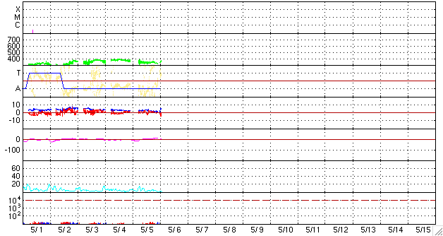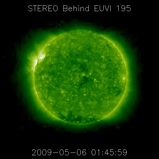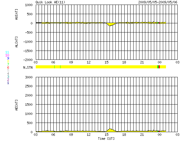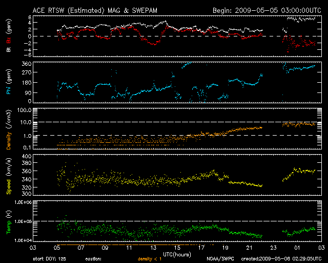 2009/ 5/ 6 11:30 更新 360km/秒の低速太陽風が続いています。これから高速風がやって来るでしょう。 担当 篠原 太陽風は、速度360km/秒とまだ低速状態です。 磁場強度は、2nTから5nTへ少し強くなっています。 これから高速太陽風領域に入ると予想していますが、 ACEの太陽風密度が10個/cm^3へゆっくりと増えています。 この変化が、高速風領域が近づいていることを示しているのかもしれません。 今後、磁場強度、速度と続いて増加に向かう可能性が高いので注目してください。 現在の磁気圏はとても静かです。 これからやってくる高速風は、 前周期の最高速度は550km/秒ほど、高速状態は4日ほど続きました。 前回は、3日目に最も速度が高まりました。 普段は、1〜2日目くらいに最も高くなるのですが、今回はどうなるでしょうか。 SOHOの写真が止まっているので、STEREO Behindを掲載します。 STEREO Behindから見える太陽は、地球とは3日半ほどのずれがあるため、 今度の高速風をもたらすコロナホールは、既に西の端に消えています。 今日の写真の太陽の中心に見えているのは、さらにその次の高速風をもたらすコロナホールです。 前周期は4月16日に始まり、今回は、5月13-14日頃に回帰しそうです。 太陽は無黒点で静穏です。 しかし、STEREO Behindの太陽コロナを見ると、 太陽の東側(左側)の、まだ地球から見えていない部分に明るい活動領域が見えます。 このくらいの明るさだと、黒点を伴っているかもしれません。 3日ほどすると、地球からも見えるようになるでしょう。 楽しみに待ちましょう。 昨夜、帰国しました。今後は通常の更新ペースにもどります。 日本の春の気候は快適ですね。 STEREO Behindによる太陽コロナの写真。衛星の位置の関係で、地球よりも3日半ほど先の太陽を見ています。6日11時(世界時6日2時 (c) NASA ![]() SOHO MDIによる、太陽写真。無黒点です。6日10時半(世界時6日1時半)。 (c) SOHO (ESA & NASA) ![]() ACEが観測した太陽風の磁場(1番上の枠、白線は全体の強度、赤線は南北成分) および、太陽風の密度(3番目の橙線)、速度(4番目の黄線) (c) NOAA/SWPC ![]() リアルタイムAE指数 下段のAEグラフの値が高くなると、オーロラ活動が活発化しています。 (c) 京都大学, NICT ![]() シベリアで観測された3日間の磁場データ 右側の3分の1が、昨日のデータになります。グラフが上がったり下がったりすると、オーロラ活動が活発化しています。 (c) NICT ![]() 27日の太陽周期に合わせたデータプロット 太陽が同じ面を地球に向けていた27日前の変化から、今後を予想することができます。 (c) NICT