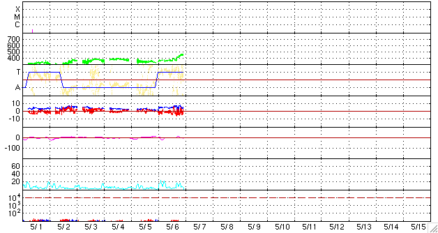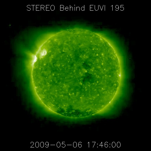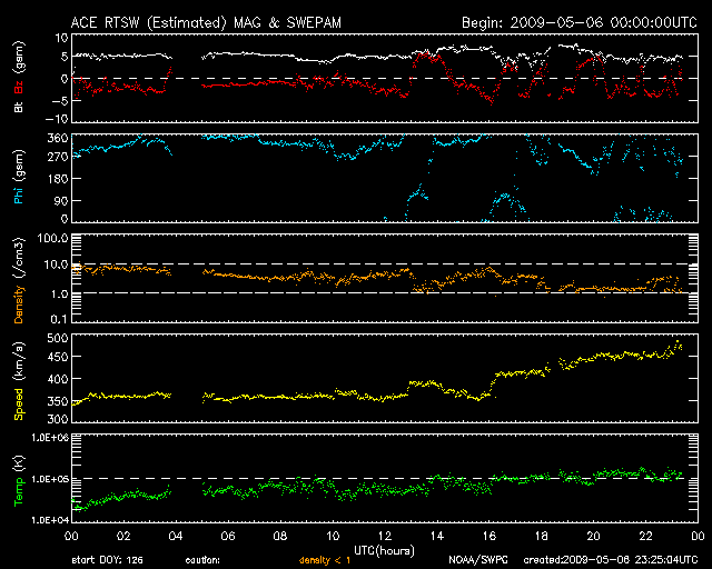 2009/ 5/ 7 08:25 更新 太陽風の速度が、460km/秒に上昇しています。高速太陽風が始まりました。 担当 篠原 太陽風の速度が、上昇傾向に入っています。 速度の変化は、昨夜、6日22時(世界時6日13時)頃から始まっています。 360km/秒の低速状態から、ゆっくりと上昇が始まり、 半日ほど経過した現在、460km/秒とやや高速になっています。 太陽風の磁場強度は、昨日の時点で5nTに強まっていましたが、 現在まで、多少前後しながらもこのレベルで安定してます。 27日周期の図で比較すると、 前周期よりも半日ほど遅れて速度の変化がやって来ました。 前周期は、3日ほどかけて更に速度が上がって行きましたが、 今回はどうなるでしょうか。 ただし、今回も高速風領域としては、 それほど大きな変化にはならないでしょう。 磁気圏は、比較的静穏な状態が続いています。 太陽風の速度が上がって来たことと、磁場が-3nTほどの南寄りになっているため、 AE指数には200〜300nTほどの小規模の変化が発生しています。 今後も、高速風の継続に伴って、小中規模の活動が発生すると見込まれます。 高速風は、これから3日程度続くと予想されます。 開始が遅れた分、終わりが伸びるのか、 高速風の規模が小さくなってしまったのか、そのあたりも興味が持たれます。 太陽コロナは、今日もSTEREO Behindの写真です。 現在の高速風に関係したコロナホールは既に見えなくなり、 次の高速風(5月13日ころ)につながるコロナホールが、 太陽の中心を通過しつつあります。 太陽の北東(左上)には、明るい領域が2カ所見えています。 まだ地球側からは見えていませんが、ここに黒点が発生しているかもしれません。 STEREOの観測では、フレアも起こっている様です。 こちら側へ回ってくる頃が楽しみです。 地球から見える太陽面は、無黒点のままで、 GOESのX線グラフも静穏です。 STEREO Behindによる太陽コロナの写真。衛星の位置の関係で、地球よりも3日半ほど先の太陽を見ています。7日3時(世界時6日18時 (c) NASA ![]() ACEが観測した太陽風の磁場(1番上の枠、白線は全体の強度、赤線は南北成分) および、太陽風の密度(3番目の橙線)、速度(4番目の黄線) (c) NOAA/SWPC ![]() リアルタイムAE指数 下段のAEグラフの値が高くなると、オーロラ活動が活発化しています。 (c) 京都大学, NICT ![]() シベリアで観測された3日間の磁場データ 右側の3分の1が、昨日のデータになります。グラフが上がったり下がったりすると、オーロラ活動が活発化しています。 (c) NICT ![]() 27日の太陽周期に合わせたデータプロット 太陽が同じ面を地球に向けていた27日前の変化から、今後を予想することができます。 (c) NICT