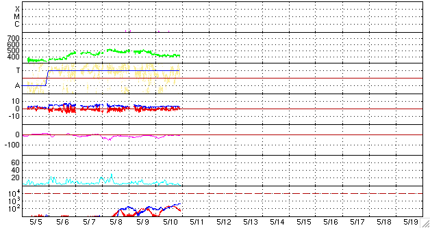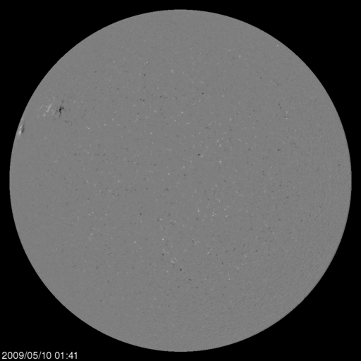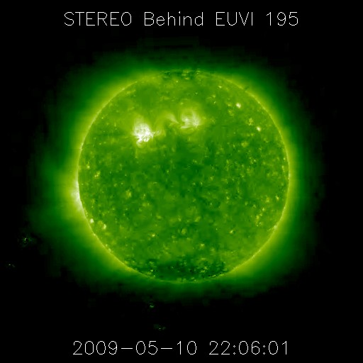 2009/ 5/11 08:28 更新 太陽風は通常の速度レベルに下がりました。太陽は無黒点です。 担当 篠原 SOHOの可視光写真が更新され、ふたつめの活動領域が視野に入って来ました。 しかし、こちらの活動領域も白斑があるだけで、今のところ黒点の姿は見えません。 まだ、完全には見えきっていないようなので、もうしばらく注視しましょう。 GOESのX線データも、Bクラスの小さな活動があるだけで、それ以上の目立った変動はありません。 こちら側へ回って来て、落ち着いてしまったのでしょうか。 今日の4枚目の写真は、STEREO Behindです。 この衛星で、活動領域を正面から見てみましょう。 明るく光っている場所では、磁場が強まっています。 強まった磁力線に沿って高温のコロナが閉じ込められるので、 明るい筋となって見えているのです。 右側の活動領域は、N極とS極の分布がやや広がっているためか(SOHO磁場写真参照)、 その間をつなぐ様に、磁力線の明るい筋がふくれ上がっています。 左側の活動領域は、両極が詰まっているので、 狭い領域に明るい筋がごちゃごちゃと集まって見えます。 更に、ふたつの活動領域をまたぐ様に、 明るい磁力線が大きくふくれあがっているのも見えます。 右側の活動領域のN極(磁場写真の白)と左側の活動領域のS極(磁場写真の黒)を つなぐ磁力線の構造があるようです。 こういった、活動領域をまたぐ大きな磁力線の筋は時々見ることができます。 時には、南北半球をまたぐような大きな構造も現れます。 そんな活発な太陽活動の始まりが待たれます。 太陽風は、410km/秒と通常の速度に下がり、安定しています。 磁場強度は、3nTとやや弱めです。 これから2〜3日ほど、落ち着いた太陽風が続くでしょう。 磁気圏活動もだいぶ静かになっています。 太陽風磁場の南寄り傾向はまだ続いていて、頻繁なオーロラ活動をもたらしています。 しかし、速度は下がり、磁場強度も弱まっているため、活動はどれも小さなものです。 次の太陽風の変化は、13-14日くらいにやって来ると思われます。 今回も、比較的規模の小さい高速風となるでしょう。 SOHO EIT195による、太陽コロナ。11日2時半(世界時10日17時半)。 (c) SOHO (ESA & NASA) ![]() SOHOによる太陽の可視光写真。活動領域に、白斑が見えています。10日14時(世界時10日5時)。 (c) SOHO (ESA & NASA) ![]() SOHOによる、太陽磁場。北東(左上)に、2つめの磁場の強まりも見えて来ました。10日10時半(世界時10日1時半)。 (c) SOHO (ESA & NASA) ![]() STEREO behind衛星による太陽コロナ写真。ふたつの活動領域が、太陽の中心に見えています。 (c) NASA ![]() GOES衛星の太陽X線データ (c) NOAA/SWPC ![]() ACEが観測した太陽風の磁場(1番上の枠、白線は全体の強度、赤線は南北成分) および、太陽風の密度(3番目の橙線)、速度(4番目の黄線) (c) NOAA/SWPC ![]() リアルタイムAE指数 下段のAEグラフの値が高くなると、オーロラ活動が活発化しています。 (c) 京都大学, NICT ![]() シベリアで観測された3日間の磁場データ 右側の3分の1が、昨日のデータになります。グラフが上がったり下がったりすると、オーロラ活動が活発化しています。 (c) NICT ![]() 27日の太陽周期に合わせたデータプロット 太陽が同じ面を地球に向けていた27日前の変化から、今後を予想することができます。 (c) NICT