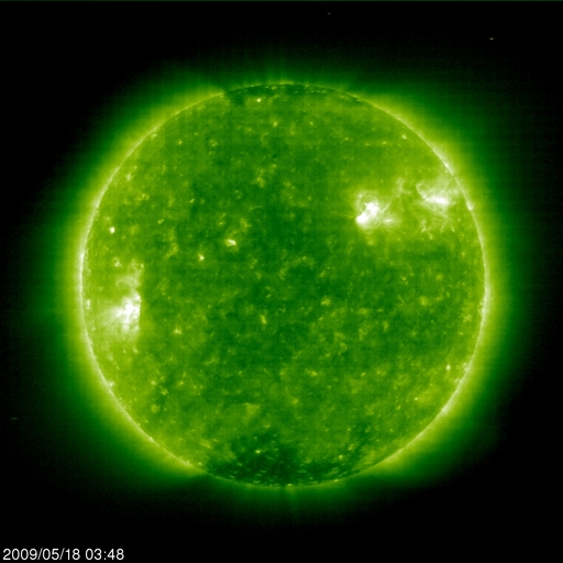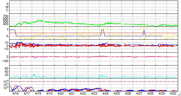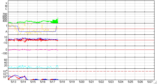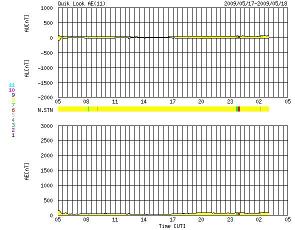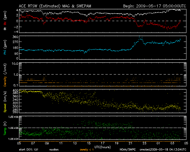 2009/ 5/18 13:06 更新 太陽風の密度が減少しています。速度は300km/秒に下がり、低速風です。 担当 篠原 昨日のニュース以降、太陽風のプラズマ密度が大きく低下しています。 ほぼ1日にわたって、0.1〜0.2個/cm^3というかなり少ない値が続いています。 このため、ACE衛星の太陽風観測器の測定精度が悪くなり、 速度のデータが散らばる様になっています。 太陽風の速度も、密度低下を追う様に、 400km/秒から300km/秒へと低下しました。 速度も遅くなり、とても穏やかな太陽風です。 ACEの図の終わり付近で、密度のグラフは上がりかけている様です。 密度の薄い太陽風は、このあたりで終わるのかもしれません。 磁気圏のオーロラ活動は、静穏です。 速度が低下したとともに、磁場の方向が北寄りに推移していたことが 効いているのでしょう。 穏やかな太陽風は、まだまだ続きます。 27日周期の図の前周期のグラフは、まだずっと低速です。 太陽では、1017黒点群は、淡いながらもまだ見えています。 東端(左端)の白斑も、見えています。 しかし、X線データにフレア活動はなく、太陽は穏やかです。 SOHO EIT195による、太陽コロナの様子。18日13時(世界時18日4時)。 (c) SOHO (ESA & NASA) ![]() SOHOによる、太陽可視光写真。1017黒点群は小さく見えています。18日8時半(世界時17日23時半)。 (c) SOHO (ESA & NASA) ![]() ACEが観測した太陽風の磁場(1番上の枠、白線は全体の強度、赤線は南北成分) および、太陽風の密度(3番目の橙線)、速度(4番目の黄線) (c) NOAA/SWPC ![]() リアルタイムAE指数 下段のAEグラフの値が高くなると、オーロラ活動が活発化しています。 (c) 京都大学, NICT ![]() シベリアで観測された3日間の磁場データ 右側の3分の1が、昨日のデータになります。グラフが上がったり下がったりすると、オーロラ活動が活発化しています。 (c) NICT ![]() 27日の太陽周期に合わせたデータプロット 太陽が同じ面を地球に向けていた27日前の変化から、今後を予想することができます。 (c) NICT