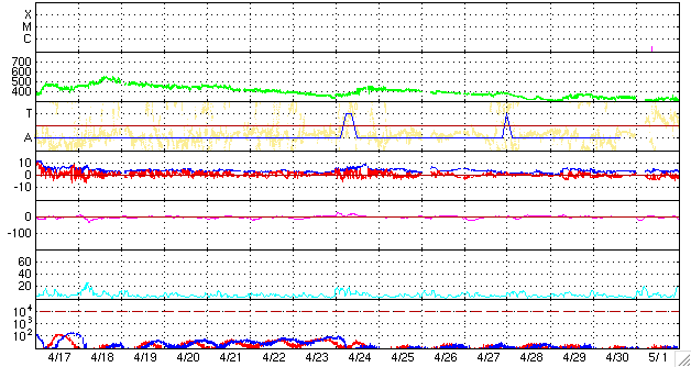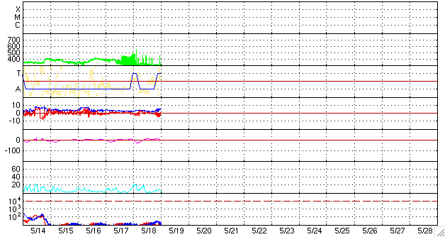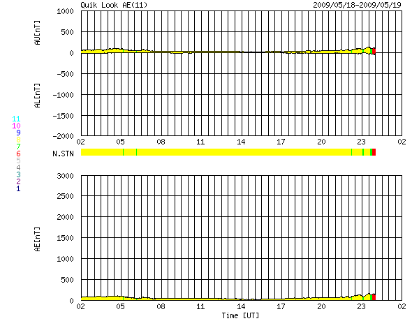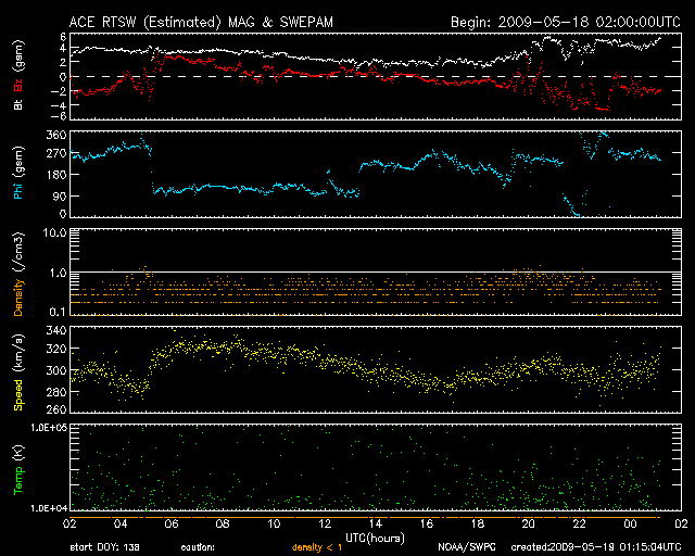 2009/ 5/19 10:06 更新 300km/秒とかなり遅い太陽風が続いています。磁気圏も静かです。 担当 篠原 低速の穏やかな太陽風が続いています。 ACE衛星の観測によると、速度は300km/秒でほぼ安定しています。 かなり遅い速度です。 太陽風のプラズマ密度の低下は、この1日は、0.2〜0.5個/cm^3程度になり、 昨日の0.1個/cm^3と比べると、やや戻しています。 それでも、低めの状態が続いているため、速度のグラフはやや散った様になっています。 太陽風の磁場強度は2〜4nTで、やや弱めの状態です。 AE指数を見ると、磁気圏活動はとても静かです。 穏やかな太陽風は、更に2週間ほど続きます。 27日周期の図で、前周期の次の高速風が現れるのは5月6日です。 ただし、5月6日に始まる高速風も、やっと500km/秒に達した程度で、 それほど目立った変化ではありません。 太陽では、1017黒点群は更に淡くなっていますが、まだ姿を見せています。 X線データを見ても、フレア活動は全くなく、太陽はとても静かです。 今回の、3つまとまって活動領域が出現したことが、 太陽活動活発化の兆しなのかどうなのか、現時点では分かりません。 とりあえず、1017黒点群が粘っていることで、 今月の無黒点日の日数が、20日台前半くらいには下がりそうです。 SOHO EIT195による、太陽コロナの様子。19日10時(世界時19日1時)。 (c) SOHO (ESA & NASA) ![]() SOHOによる、太陽可視光写真。1017黒点群は、まだ残っています。19日6時(世界時18日21時)。 (c) SOHO (ESA & NASA) ![]() ACEが観測した太陽風の磁場(1番上の枠、白線は全体の強度、赤線は南北成分) および、太陽風の密度(3番目の橙線)、速度(4番目の黄線) (c) NOAA/SWPC ![]() リアルタイムAE指数 下段のAEグラフの値が高くなると、オーロラ活動が活発化しています。 (c) 京都大学, NICT ![]() シベリアで観測された3日間の磁場データ 右側の3分の1が、昨日のデータになります。グラフが上がったり下がったりすると、オーロラ活動が活発化しています。 (c) NICT ![]() 27日の太陽周期に合わせたデータプロット 太陽が同じ面を地球に向けていた27日前の変化から、今後を予想することができます。 (c) NICT