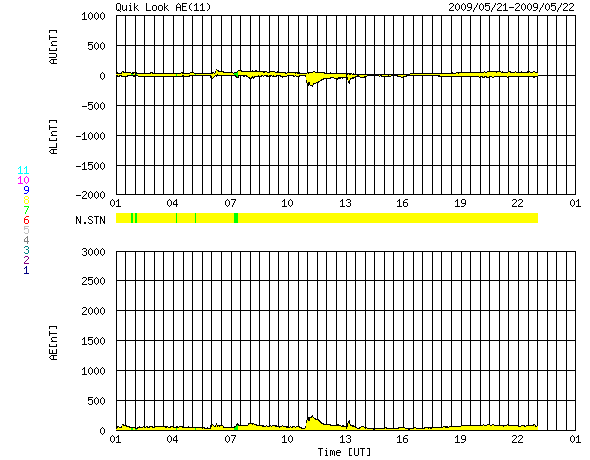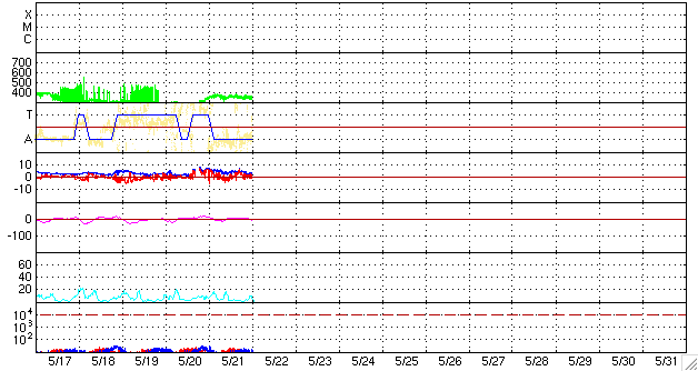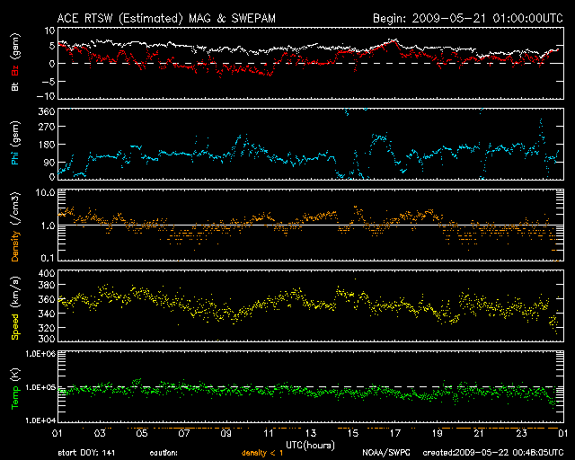 2009/ 5/22 09:48 更新 低速の太陽風が続いています(速度350km/秒)。太陽も無黒点で穏やかです。 担当 篠原 太陽風は、速度350km/秒と低速で推移しています。 昨日、磁場強度が7nTとやや強まっていたのですが、 現在はそれも下がって、3nTとやや弱めになっています。 前周期の太陽風は、昨日くらいに400km/秒台まで速度が回復していたのですが、 今周期はそれもなく、低速の太陽風が続いています。 磁気圏も静穏です。 AE指数には、200nTほどの小さな変動がひとつ見られるだけで、 その他は完全に静穏です。 SOHO EIT195を見ると、太陽の北東(左上)の端に、コロナホールの影が見えています。 これは、前周期にも見られたものです。 このコロナホールは、規模が小さいことと、緯度が高めのためでしょうか、 前周期の太陽風には、影響は見られませんでした。 今周期も、特に発達した様子は見られないので、目立った影響はなさそうです。 もう2日ほどすると、よく見える様になります。 その様子に注目しましょう。 太陽風は、まだまだ穏やかな状態が続きます。 太陽は無黒点です。 こちらも全く静穏です。 SOHO EIT195による、太陽コロナの様子。22日9時半(世界時22日0時半)。 (c) SOHO (ESA & NASA) ![]() SOHOによる、太陽可視光写真。太陽は無黒点です。22日6時(世界時21日21時)。 (c) SOHO (ESA & NASA) ![]() ACEが観測した太陽風の磁場(1番上の枠、白線は全体の強度、赤線は南北成分) および、太陽風の密度(3番目の橙線)、速度(4番目の黄線) (c) NOAA/SWPC ![]() リアルタイムAE指数 下段のAEグラフの値が高くなると、オーロラ活動が活発化しています。 (c) 京都大学, NICT ![]() シベリアで観測された3日間の磁場データ 右側の3分の1が、昨日のデータになります。グラフが上がったり下がったりすると、オーロラ活動が活発化しています。 (c) NICT ![]() 27日の太陽周期に合わせたデータプロット 太陽が同じ面を地球に向けていた27日前の変化から、今後を予想することができます。 (c) NICT