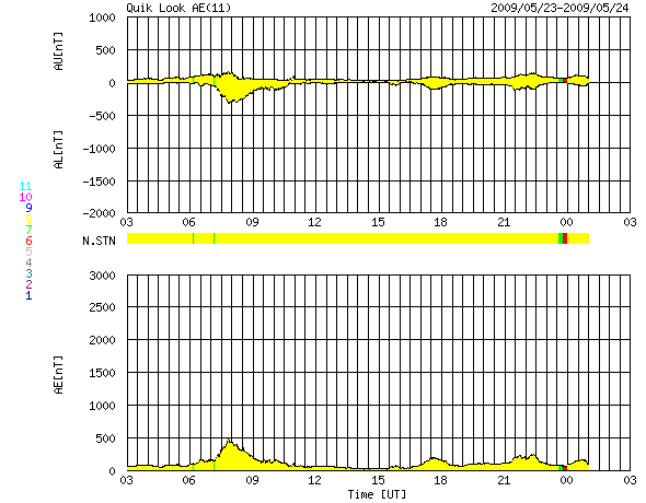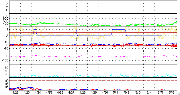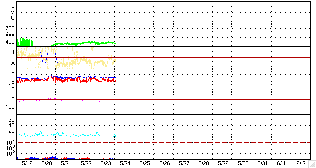 2009/ 5/24 11:59 更新 1018黒点群は、見えなくなりました。太陽風は低速で、穏やかです。 担当 篠原 昨日出現した1018黒点群(NOAAの番号が付きました)ですが、 早くも弱まっています。 現在のSOHOの可視光写真では、既に黒点を見つけることはできません。 微かに白斑が見えるだけです。 この群は、短時間の出現に終わりそうです。 フレア活動も見られず、太陽は穏やかです。 太陽風は、360〜380km/秒と低速で推移しています。 磁場強度も、5nTと通常の強さです。 一方、太陽風磁場の南北成分は、 ゆらゆらと南を向いたり、北を向いたりしています。 この影響で、小規模のオーロラ活動(速度が遅いので小規模に留まっています)が、 数時間毎に起きています。 AE指数では、500nTから200nTの変化が度々観測されています。 今後も、低速の穏やかな太陽風が続くと予想されます。 27日周期の図では、前周期の最後にようやく次の高速風が見えて来ました。 6月2-3日頃に回帰すると思われる、速度の変動です。 ただ、前回はやっと500km/秒に達した程度の規模の小さな高速風でした。 今回はどうなるでしょうか。 まだ10日近く先のことです。 SOHO EIT195による、太陽コロナの様子。24日11時半(世界時24日2時半)。 (c) SOHO (ESA & NASA) ![]() SOHOによる、太陽可視光写真。南東(左下)の黒点群は、見えなくなっています。24日9時(世界時24日0時)。 (c) SOHO (ESA & NASA) ![]() GOES衛星の太陽X線データ (c) NOAA/SWPC ![]() ACEが観測した太陽風の磁場(1番上の枠、白線は全体の強度、赤線は南北成分) および、太陽風の密度(3番目の橙線)、速度(4番目の黄線) (c) NOAA/SWPC ![]() リアルタイムAE指数 下段のAEグラフの値が高くなると、オーロラ活動が活発化しています。 (c) 京都大学, NICT ![]() シベリアで観測された3日間の磁場データ 右側の3分の1が、昨日のデータになります。グラフが上がったり下がったりすると、オーロラ活動が活発化しています。 (c) NICT ![]() 27日の太陽周期に合わせたデータプロット 太陽が同じ面を地球に向けていた27日前の変化から、今後を予想することができます。 (c) NICT