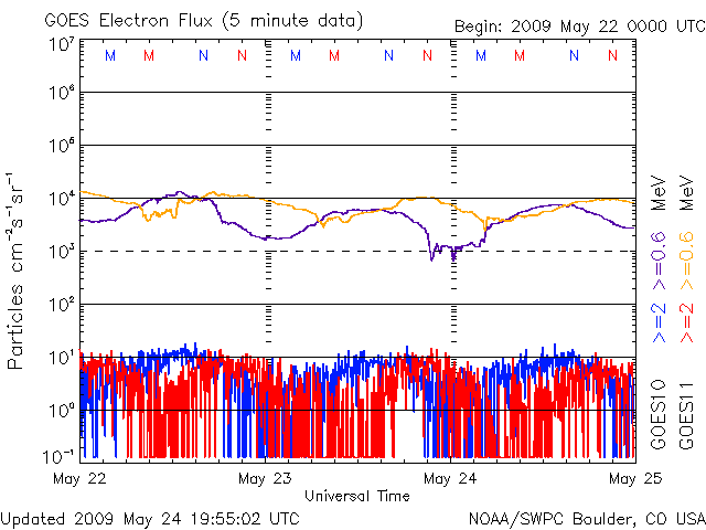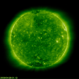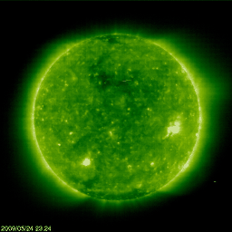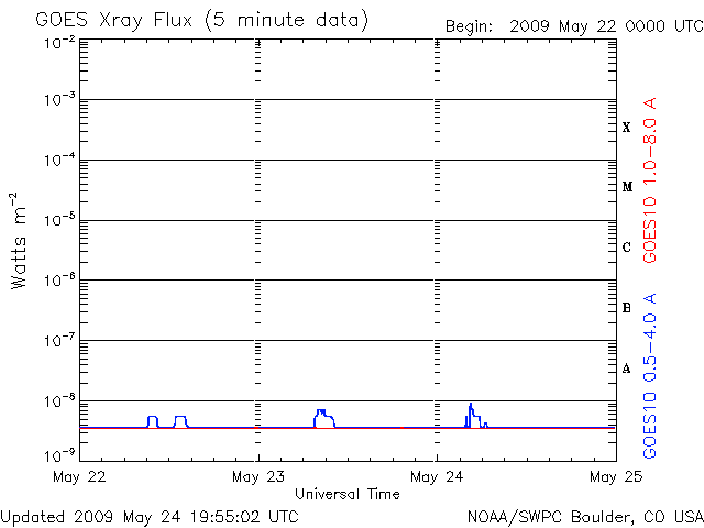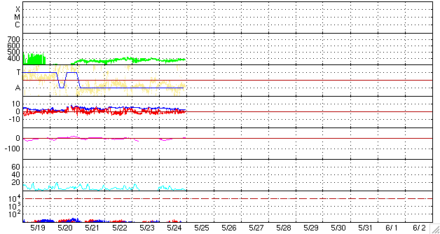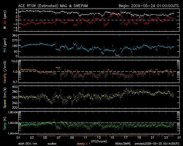 2009/ 5/25 09:06 更新 速度の遅い、穏やかな太陽風が続いています。太陽も無黒点で静穏です。 担当 篠原 穏やかな太陽風が続いています。 太陽風の速度は、昨日以降も360〜380km/秒と遅めの状態が続いています。 磁場強度は3nTに下がり、やや弱まっています。 太陽風磁場の南北成分は、振幅は小さいのですが、 比較的南寄りになっています(-2nT程度)。 そのため、AE指数も、100〜200nTくらいの小さな変動がグラフのあちこちで見られています。 それでも、基本的には静穏と言ってよいでしょう。 27日周期の図によると、 静かな状態は、来週、6月2日頃まで続くと予想されます。 SOHO EIT195(左の写真)では、太陽の中心北側(上側)に、 小規模のコロナホールが見えています。 このコロナホールは前周期も同じ様な位置に見られたのですが(右の写真)、 緯度が高めなためか、太陽風への影響は特に見られませんでした。 今回、若干緯度が下がっている様に見えます。 多少なりと、太陽風に変化が見られるでしょうか。 5月28日頃になるでしょう。 1018黒点群が消え、太陽は無黒点の状態が続いています。 X線のグラフも、とても静穏です。 SOHO衛星のEIT195カメラの映像 (c) SOHO (ESA & NASA)