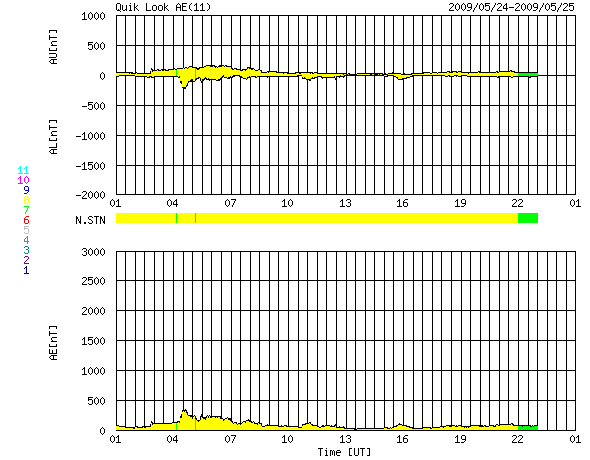 ACEが観測した太陽風の磁場(1番上の枠、白線は全体の強度、赤線は南北成分) および、太陽風の密度(3番目の橙線)、速度(4番目の黄線) (c) NOAA/SWPC ![]() リアルタイムAE指数 下段のAEグラフの値が高くなると、オーロラ活動が活発化しています。 (c) 京都大学, NICT ![]() シベリアで観測された3日間の磁場データ 右側の3分の1が、昨日のデータになります。グラフが上がったり下がったりすると、オーロラ活動が活発化しています。 (c) NICT ![]() 27日の太陽周期に合わせたデータプロット 太陽が同じ面を地球に向けていた27日前の変化から、今後を予想することができます。 (c) NICT