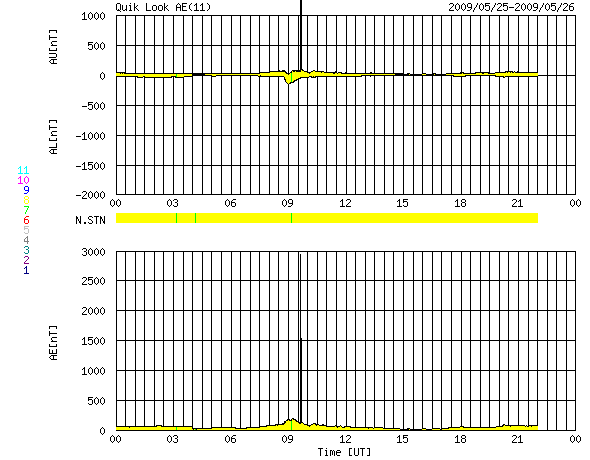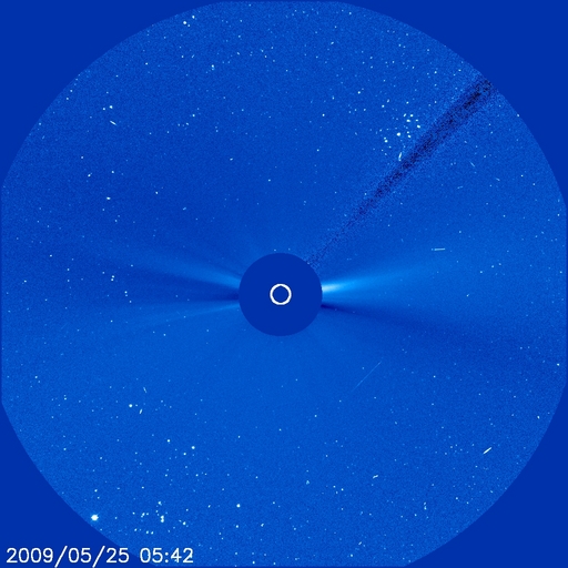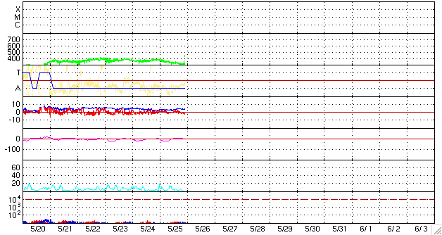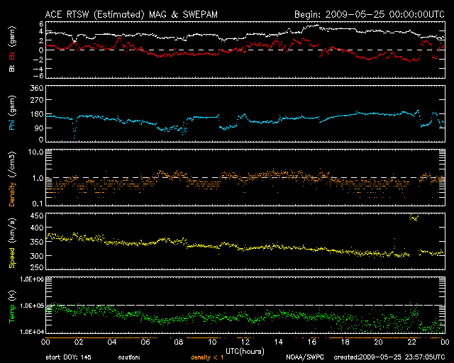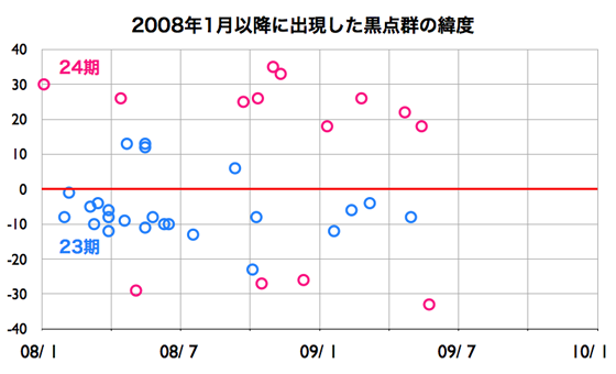 2009/ 5/26 08:57 更新 太陽風は速度が300km/秒に下がり、とても穏やかです。この1年半の黒点群の出現緯度の変化について、図を作りました。 担当 篠原 北半球に1017黒点群、南半球に1018黒点群と、 新しい第24活動周期の黒点群が、両半球に続けて発生しました。 黒点の少ない状況は続いていますが、 太陽の活動状態は少しずつ進行しているのかもしれません。 太陽の活動周期が切り替わるとき、 古い周期の黒点群は、赤道付近に集まり、 新しい周期の黒点群が、南北半球の高緯度側に現れるようになります。 そして、古い周期の黒点群は少なくなって、 新しい周期の黒点群の出現場所が低緯度側に下がってくるのです。 現在、太陽は第23期から第24期への切り替わりを迎えています。 2008年1月に初めての第24期の黒点が出現して、約1年半が経ちました。 この間、NOAAの黒点群番号は、0981群から1018群まで、38群を記録しました。 内訳は、第23期が24群、第24期が14群です。 これらについて、活動周期で色分けして、出現緯度の変化を図にしました。 1枚目の図を見て下さい。 これを見ると、第23期の黒点群の出現頻度が次第に減少していることが分かります。 また、なかなか増えない第24期の黒点群も、 長い目で見ると、それなりに安定した頻度で出現している様です。 更に、北半球側では、次第に緯度が下がっている様子も見られます。 南北半球を比較すると、周期の切り替わりは北半球が先行している様です。 この図では、第23期の黒点群はほとんど南半球側に出現していますし、 この9ヶ月は、北半球の黒点は、第24期の黒点群ばかりになっています。 出現ペースが上がらないので、じらされていますが、 太陽の活動自体は、着実に第24期へと移行している様です。 今後の問題は、太陽の活動度がどの程度まで上がるのかということかもしれません。 なお、この図は、NOAAの黒点データを基に作成しています。 黒点群にはNOAAのリストに入らなかったものもありますので、黒点の全てを含んだ図ではありません。 太陽風は、ゆっくりと速度が下がっています。 昨日の360km/秒から、今朝は300km/秒にまで落ちてしまいました。 再び、かなり遅い速度に戻っています。 磁場強度は、3nTとやや弱めで推移しています。 磁気圏もかなり穏やかです。 AE指数、シベリア磁場データには、ほとんど変化がありません。 今日、明日は、このまま静穏に過ぎて行くでしょう。 明後日、28日頃に、SOHO EIT195で見えている、 小さなコロナホールの影響が太陽風に現れるかもしれません。 変化の規模は小さいと思います。 その後も、6月2日頃までは、穏やかに推移するでしょう。 太陽は無黒点です。 SOHO LASCO C3では、プレアデス星団が画面の右側に消えつつあります。 左下には、おうし座の一等星、アルデバランが見えて来ました。 アルデバランを左端にして、 > の記号の様な星の並びが見えます。 これは、ヒアデス星団です。 2008年1月以降に出現した太陽黒点の緯度と、活動周期の変化。 (c) 作図 : 宇宙天気ニュース、データ : NOAA ![]() SOHO EIT195による、太陽コロナの様子。26日8時半(世界時25日23時半)。 (c) SOHO (ESA & NASA) ![]() SOHO LASCO C3の、右上にプレアデス星団、左下にアルデバランが見えています。 (c) SOHO (ESA & NASA) ![]() ACEが観測した太陽風の磁場(1番上の枠、白線は全体の強度、赤線は南北成分) および、太陽風の密度(3番目の橙線)、速度(4番目の黄線) (c) NOAA/SWPC ![]() リアルタイムAE指数 下段のAEグラフの値が高くなると、オーロラ活動が活発化しています。 (c) 京都大学, NICT ![]() シベリアで観測された3日間の磁場データ 右側の3分の1が、昨日のデータになります。グラフが上がったり下がったりすると、オーロラ活動が活発化しています。 (c) NICT ![]() 27日の太陽周期に合わせたデータプロット 太陽が同じ面を地球に向けていた27日前の変化から、今後を予想することができます。 (c) NICT
