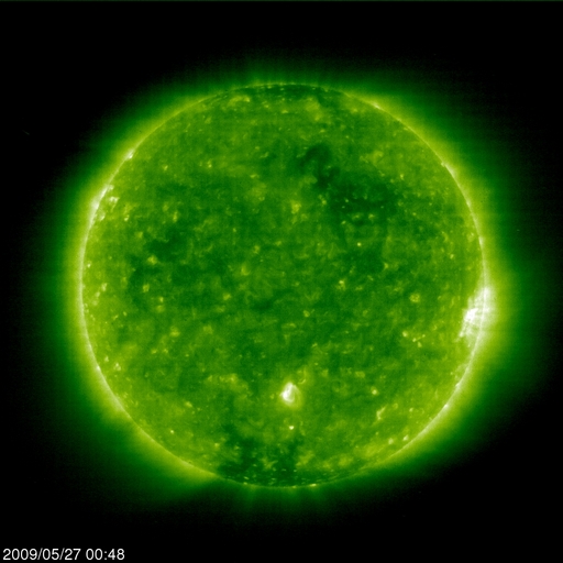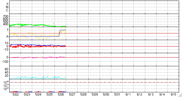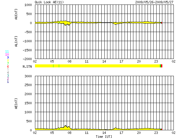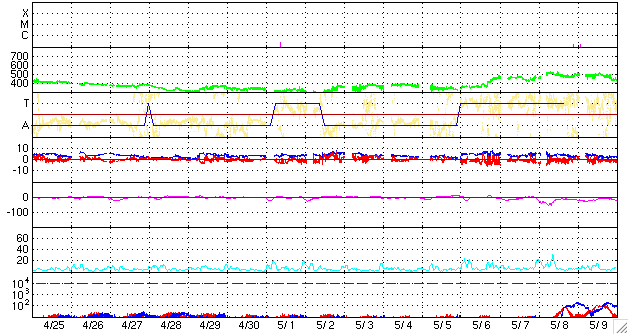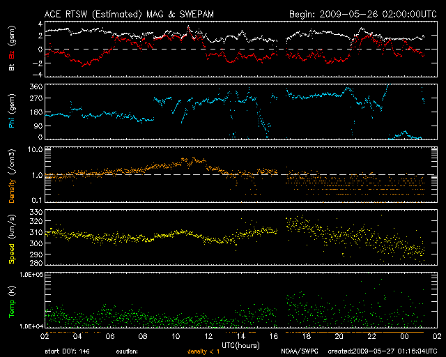 2009/ 5/27 10:06 更新 300km/秒付近の遅い太陽風が続いています。 担当 篠原 太陽風の速度は、310km/秒とかなり遅い速度で安定しています。 磁場強度も2nTヘ弱まっていて、とても穏やかな太陽風が続いています。 今朝に入って、太陽風のプラズマ密度が下がっています。 昨夜までは、1立方cmあたり1個程度あったのですが、 今朝くらいからこのレベルを割るようになりました。 太陽風の速度データが散らばる様になっているのは、この影響です。 密度の低下とともに、速度も下がっている様です。 磁気圏活動も静穏です。 AE指数では、100〜200nTくらいの小さな変化が見られますが、 これは、太陽風磁場が弱い南向きになった影響です。 このまま、今日も穏やかに過ぎて行くと思われます。 明日、28日か29日あたりに、小さなコロナホールの影響が、 太陽風に見られるかもしれません。 SOHO EIT195で、太陽の中心から北寄り(上寄り)に見える、暗い領域です。 太陽風の乱れは、やって来たとしても小規模でしょう。 その後も、穏やかな太陽風は続きます。 次の乱れは、6月2日以降になると予想されます。 その原因となるコロナホールは、SOHO EIT195の東端にかろうじて見えています。 縦に細長い影として見えています。 明日か明後日になると、より見やすくなります。 その頃に、前周期の写真と比較してみましょう。 太陽は無黒点で、静かな状態が続いています。 SOHO EIT195による、太陽コロナの様子。27日10時(世界時27日1時)。 (c) SOHO (ESA & NASA) ![]() ACEが観測した太陽風の磁場(1番上の枠、白線は全体の強度、赤線は南北成分) および、太陽風の密度(3番目の橙線)、速度(4番目の黄線) (c) NOAA/SWPC ![]() リアルタイムAE指数 下段のAEグラフの値が高くなると、オーロラ活動が活発化しています。 (c) 京都大学, NICT ![]() シベリアで観測された3日間の磁場データ 右側の3分の1が、昨日のデータになります。グラフが上がったり下がったりすると、オーロラ活動が活発化しています。 (c) NICT ![]() 27日の太陽周期に合わせたデータプロット 太陽が同じ面を地球に向けていた27日前の変化から、今後を予想することができます。 (c) NICT