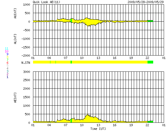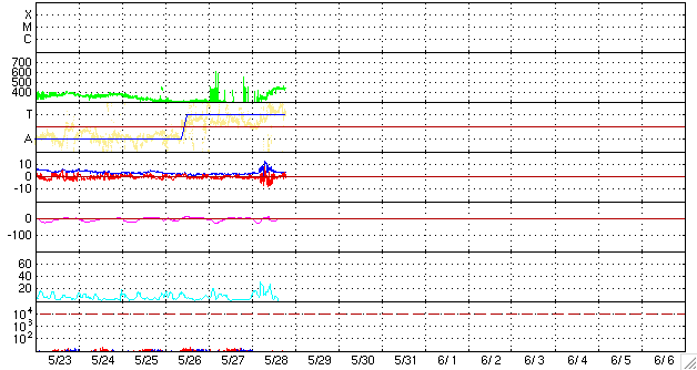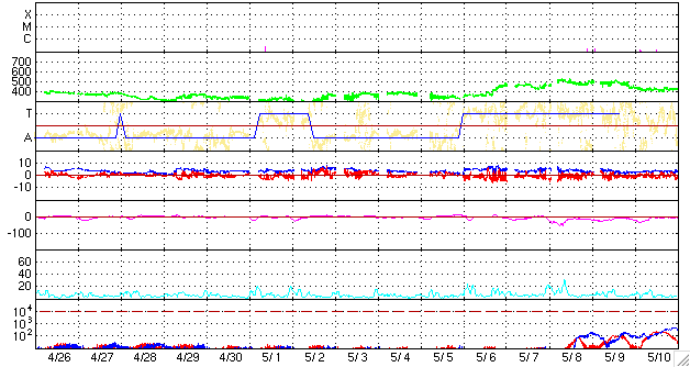 ACEが観測した太陽風の磁場(1番上の枠、白線は全体の強度、赤線は南北成分) および、太陽風の密度(3番目の橙線)、速度(4番目の黄線) (c) NOAA/SWPC ![]() リアルタイムAE指数 下段のAEグラフの値が高くなると、オーロラ活動が活発化しています。 (c) 京都大学, NICT ![]() シベリアで観測された3日間の磁場データ 右側の3分の1が、昨日のデータになります。グラフが上がったり下がったりすると、オーロラ活動が活発化しています。 (c) NICT ![]() 27日の太陽周期に合わせたデータプロット 太陽が同じ面を地球に向けていた27日前の変化から、今後を予想することができます。 (c) NICT