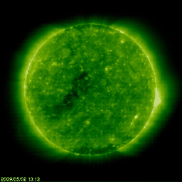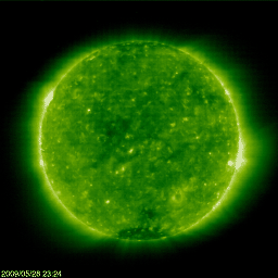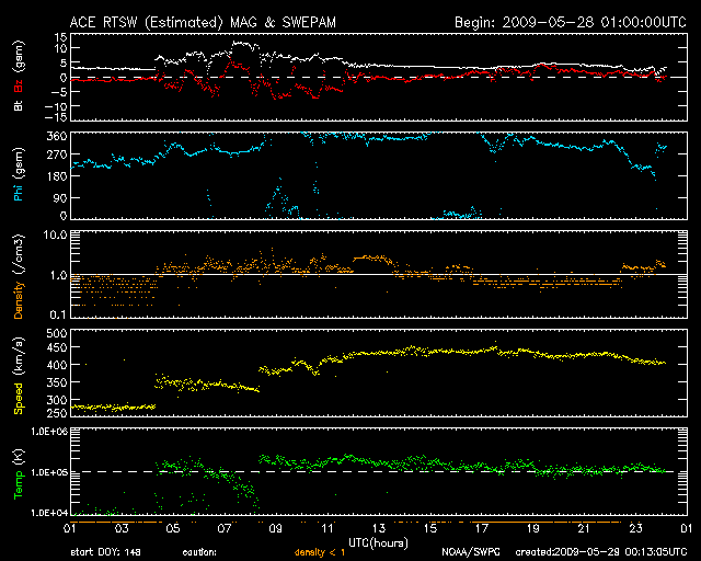 2009/ 5/29 09:14 更新 太陽風速度が、400km/秒台に上昇しています。コロナホールの影響がやって来た様です。 担当 篠原 昨日の昼、28日13時(世界時28日4時)ころから、太陽風に変化がやって来ました。 磁場強度が、3nTほどから、5〜10nTに強まり、 速度も、280km/秒から、450km/秒へと上昇しました。 小さなコロナホールの影響が、やって来たのかもしれません。 変化は小規模に留まりそうです。 昨夜のうちに磁場強度は5nT以下に下がり、 速度も450km/秒で頭打ちとなり、今朝に入って400km/秒へ低下しています。 太陽風磁場が強まったところで、南北成分が南寄りになりました。 その影響で、磁気圏活動がやや強まっています。 AE指数は、200〜500nTの小規模の変化をしています。 現在は、磁場強度が弱まるとともに、南北成分が北寄りに変わり、 磁気圏は静穏に戻っています。 今日は、現在と27日前(太陽の自転周期)の太陽コロナをSOHO EIT195で比較しましょう。 掲載している2枚の写真の、左が現在、右が27日前です。 すると、コロナホールの濃さがすっかり変わっていることが分かります。 コロナホールが中心に近づいても、なかなか濃く見えないと思っていたのですが、 規模が弱まっている様です。 すると、6月2日頃にやってくると予想していた高速風領域も、 規模が小さくなっている可能性があります。 もともと、最高速度が500km/秒程度の小さな高速風だったのですが、 これが弱まると、もう高速風でもなくなってしまいそうです。 来週の太陽風の変化については、この点も注目して下さい。 6月2日までは、このまま穏やかな状態が続くでしょう。 太陽は無黒点が続いています。 今月の無黒点記録は、20日台前半となりそうです。 SOHO衛星のEIT195カメラの映像 (c) SOHO (ESA & NASA)